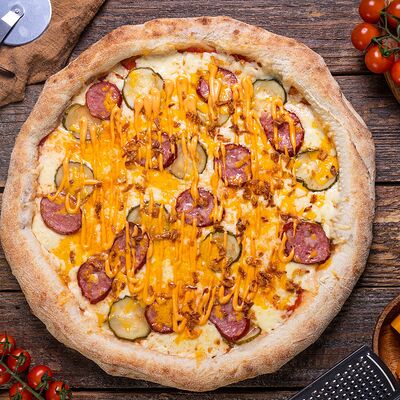 Булочка пшеничная, сосиска из мраморной говядины, соус горчичный, салат Коул-Слоу, сыр Чеддер, Салат Айсберг