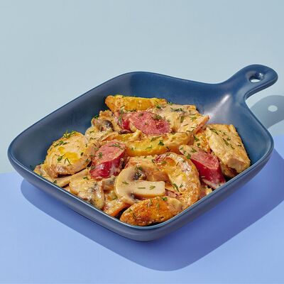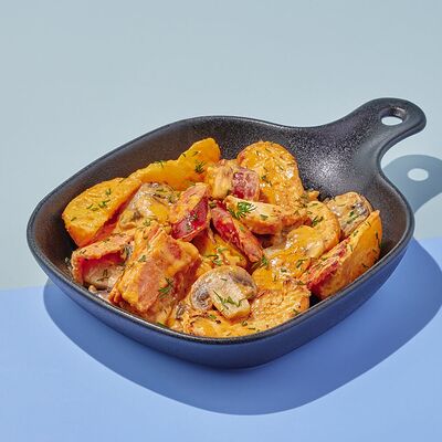 Курица (фарш), молокосодержащий продукт «Сулугуни», шпинат, картофель, репчатый лук, соль, черный молотый перец, чеснок, молотый кориандр, дрожжевое тесто, сливочное масло.