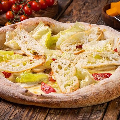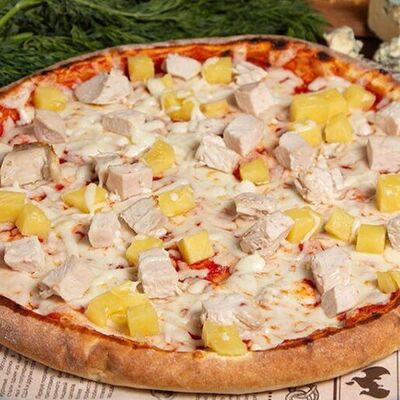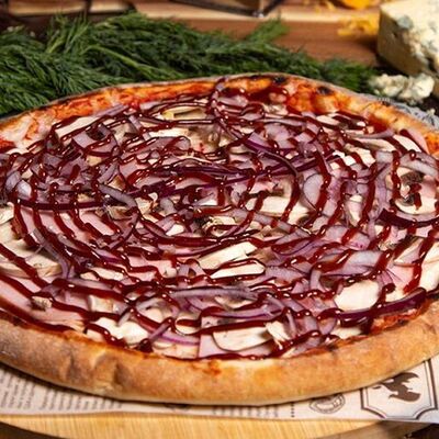 Дрожжевое тесто, фирменный соус, сыр моцарелла, курица, томаты, соус барбекю (40 см)