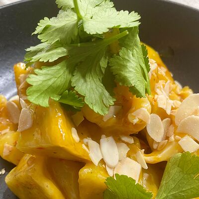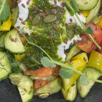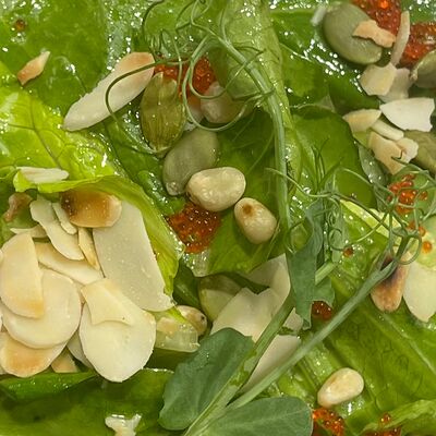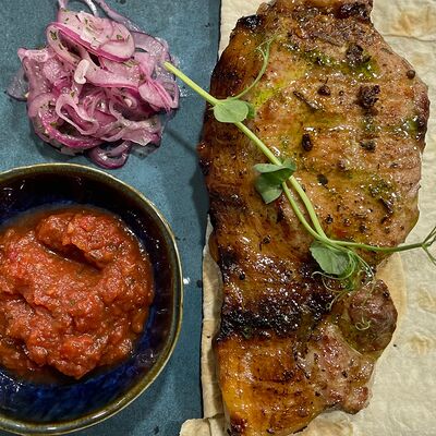 Соль, перец, зелень, курдюк. Подается с армянским лавашом и маринованным луком
