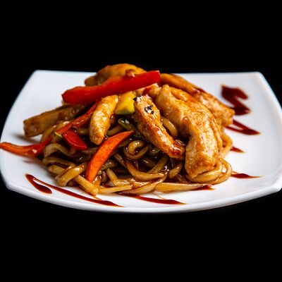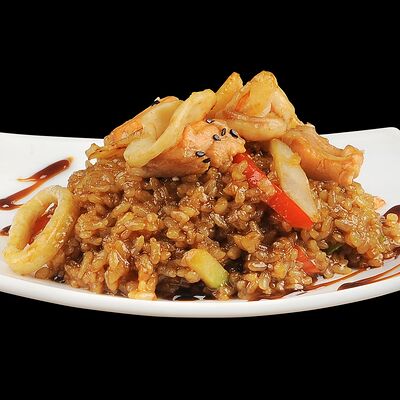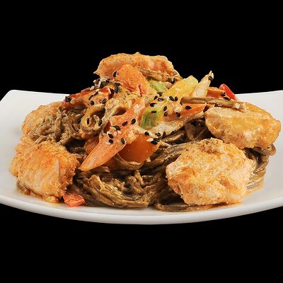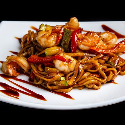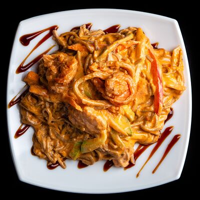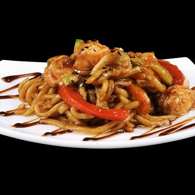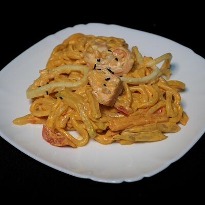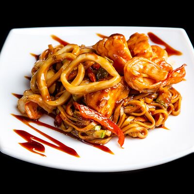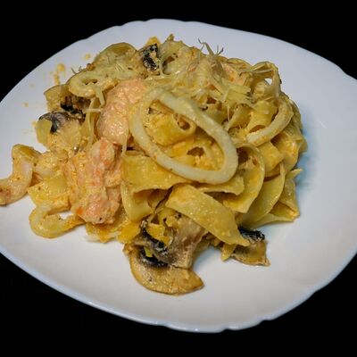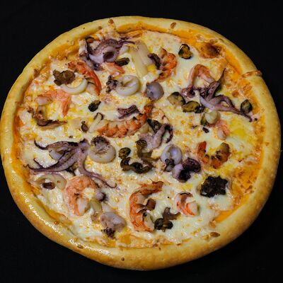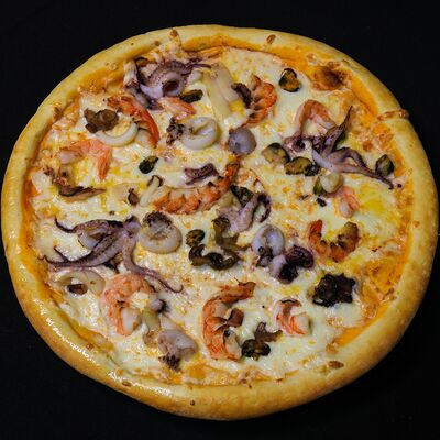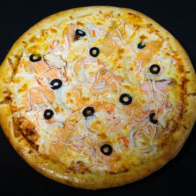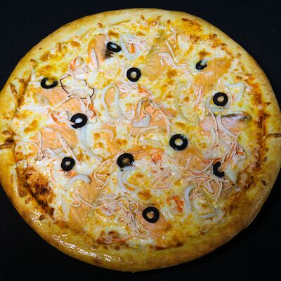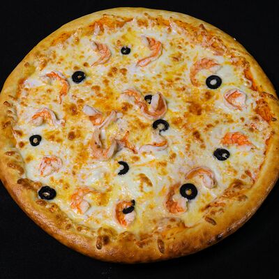 Тигровые креветки, маслины, сыр моцарелла, фирменный соус самурай (40 см)
