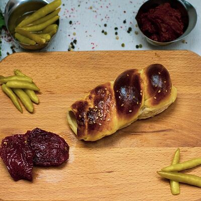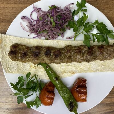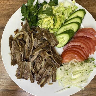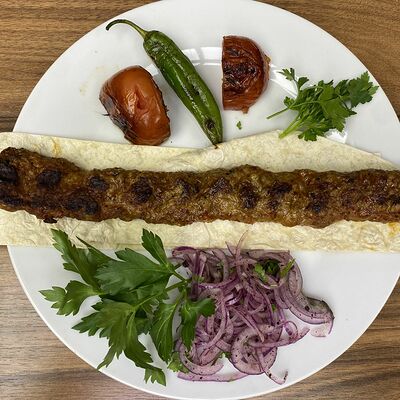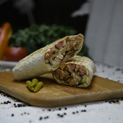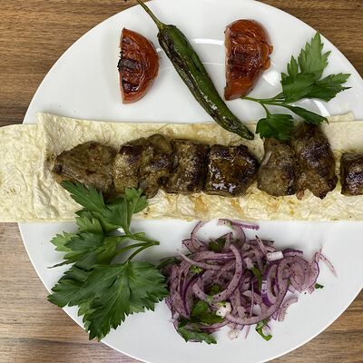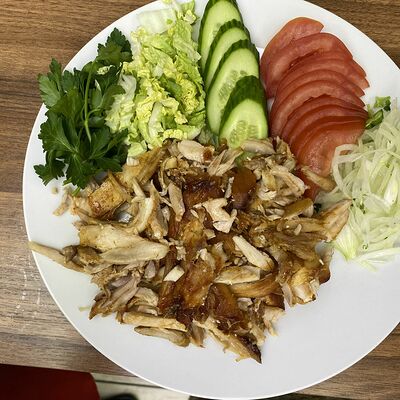 Сочная говядина халяль (нарезка), капуста (нарезка), помидоры (нарезка), огурцы (нарезка), лук репчатый (нарезка), зелень, турецкий томатный соус, фирменный белый чесночный соус от шеф-повара, пита турецкая