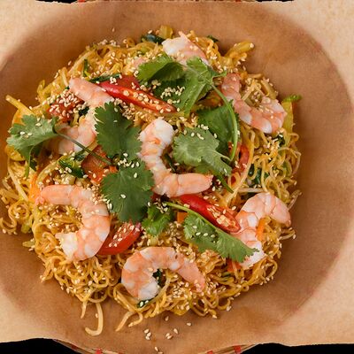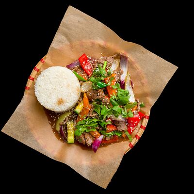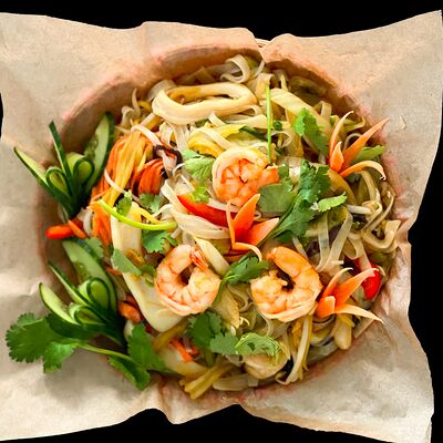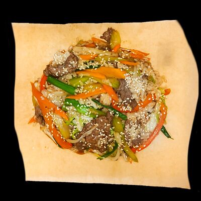 Лапша рисовая, говядина, ростки бобов, лук репчатый, лук зеленый, кинза