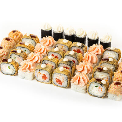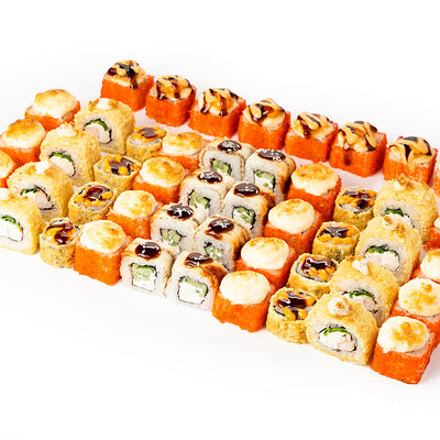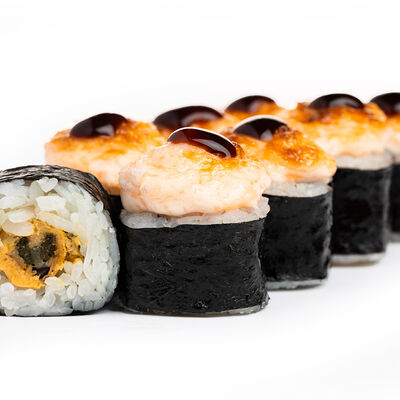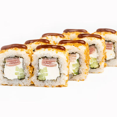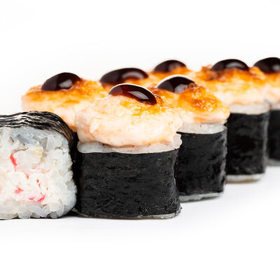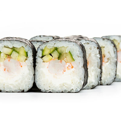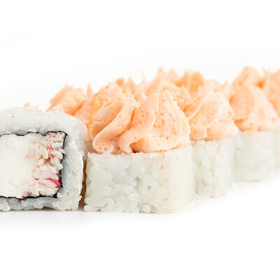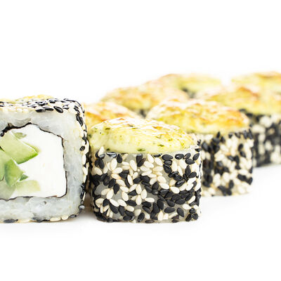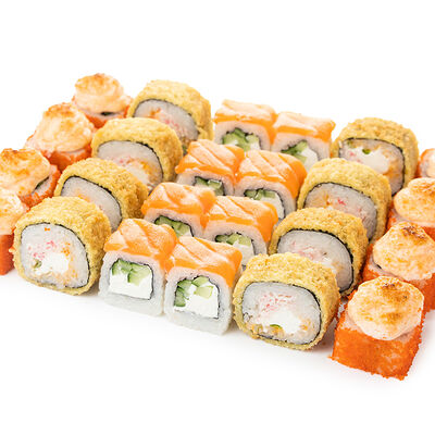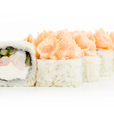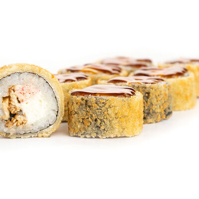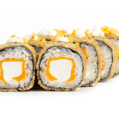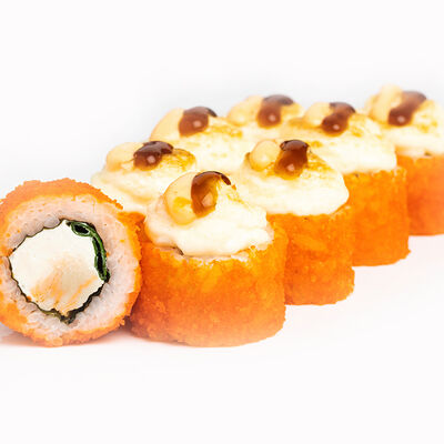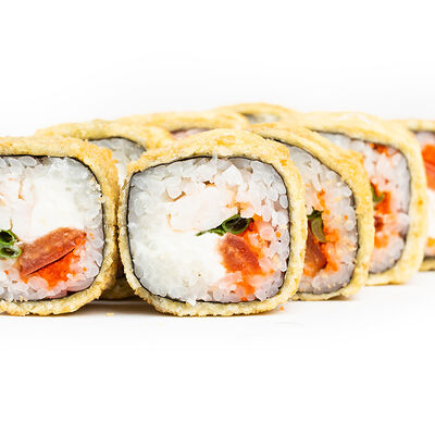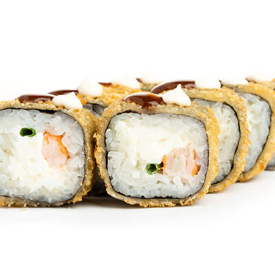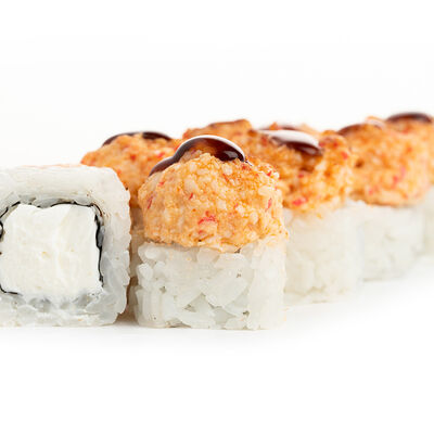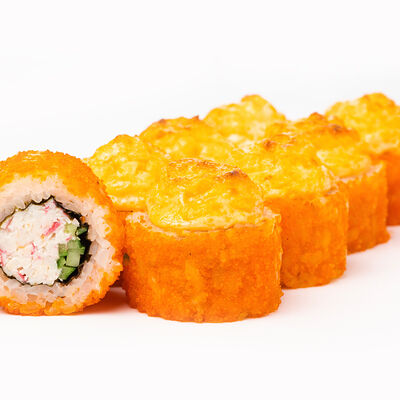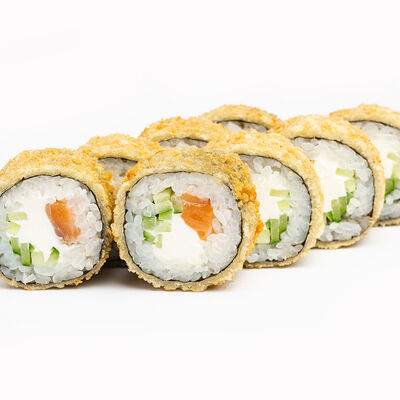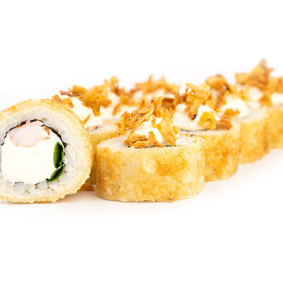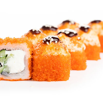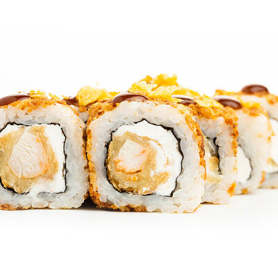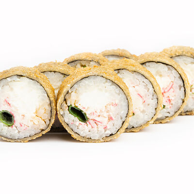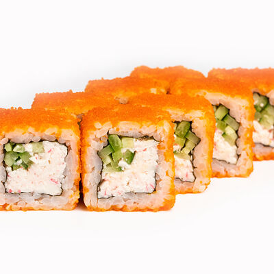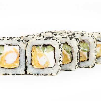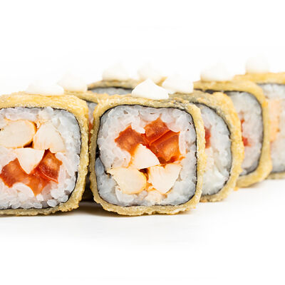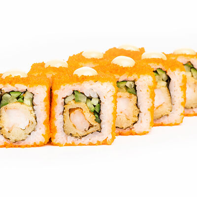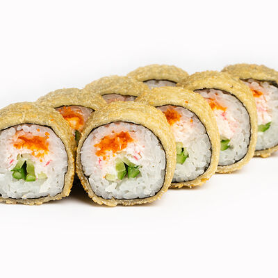Краб микс, хрустящий огурчик, панко и кляр темпура, икра тобико, рис