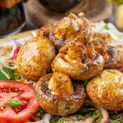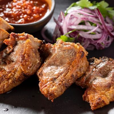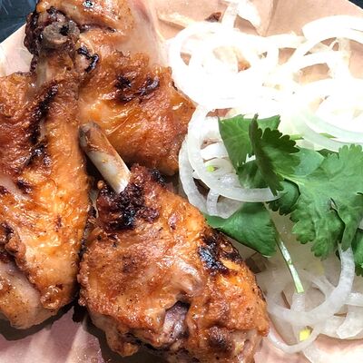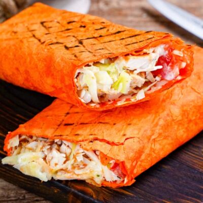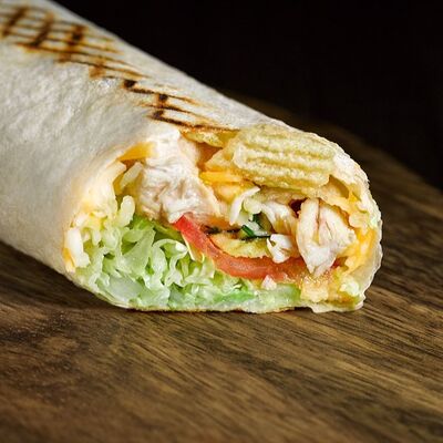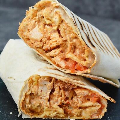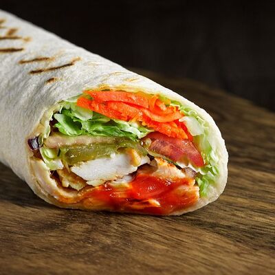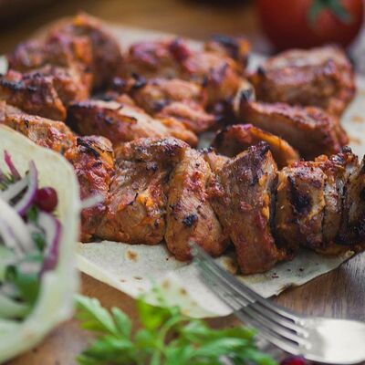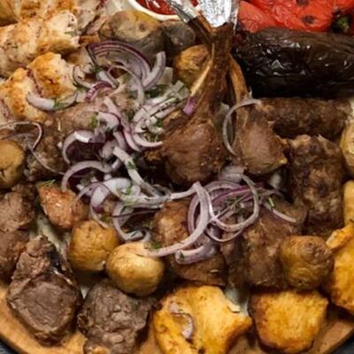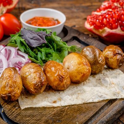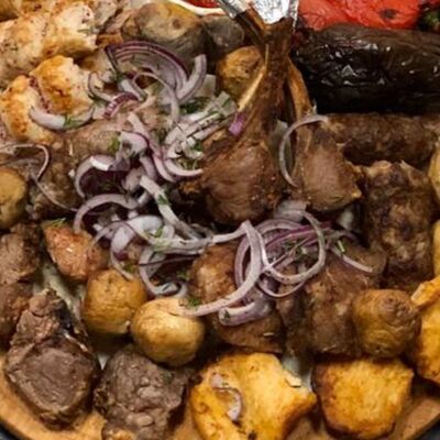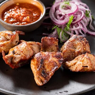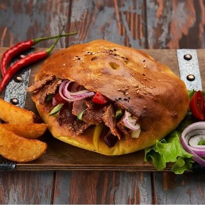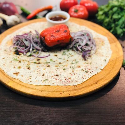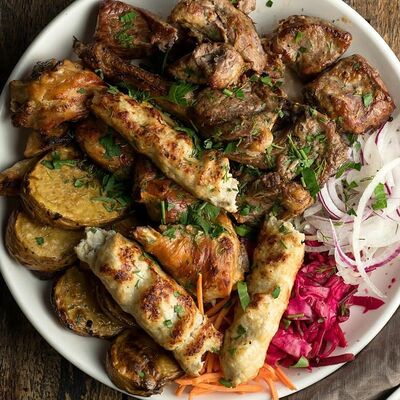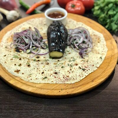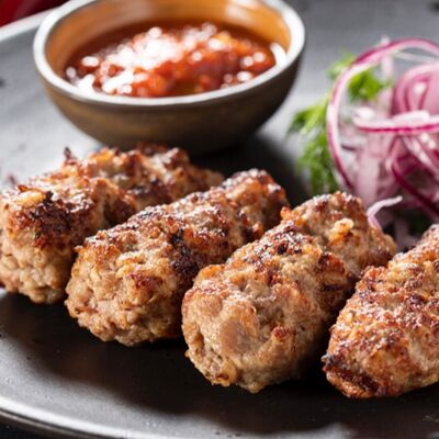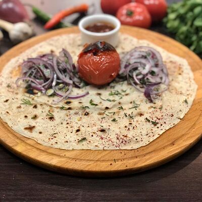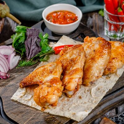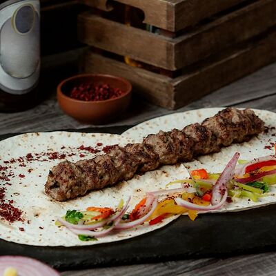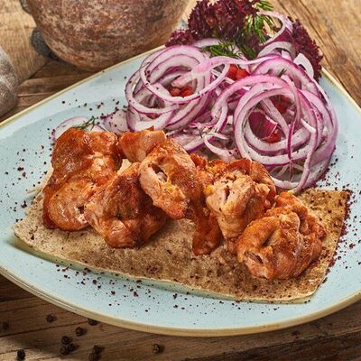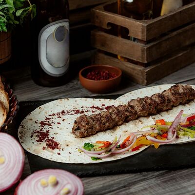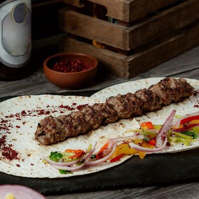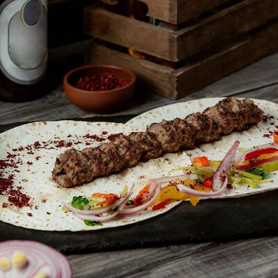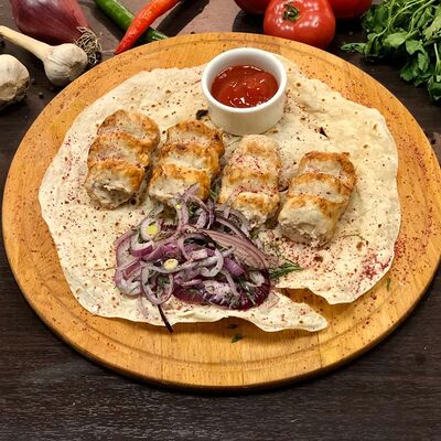 Люля-кебаб из курицы, помидоры, огурцы, соус, красный лук, солёные огурцы, капуста, красный и белый соусы, тандырный лаваш