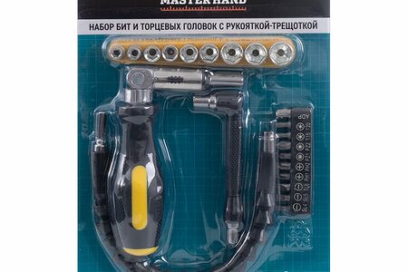 Набор бит и торцевых головок с рукояткой-трещоткой, Master Hand, подойдёт для монтажных и ремонтных работ в труднодоступных местах. В наборе 10 бит (SL4, SL5, SL6; PH1, PH2; PZ1, PZ2; T15, T20), 9 торцевых головок (5 мм, 6 мм, 7 мм, 8 мм, 9 мм, 10 мм, 11 мм, 12 мм, 13 мм), адаптер, угловая рукоятка-трещотка, угловая рукоятка, гибкий переходник. Состав: углеродистая сталь, полипропилен, термопластичная резина, АБС, ПВХ. Товар представлен в ассортименте.