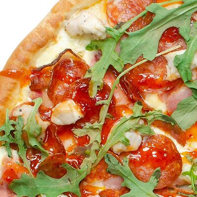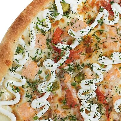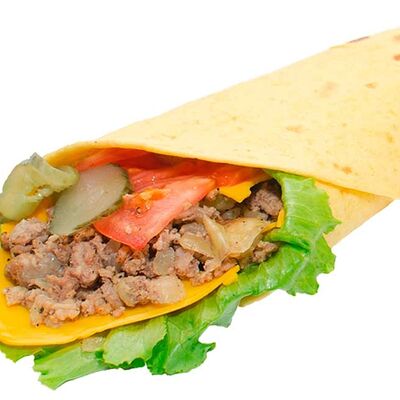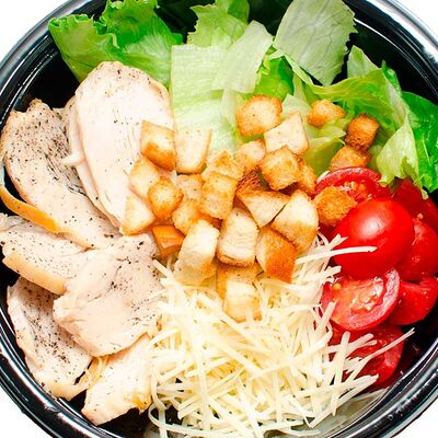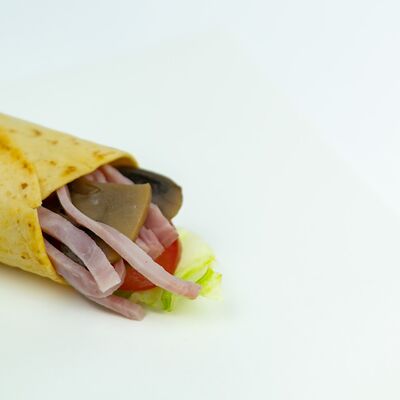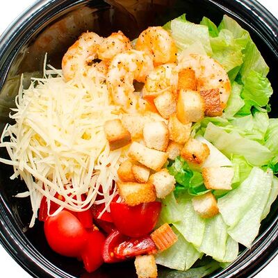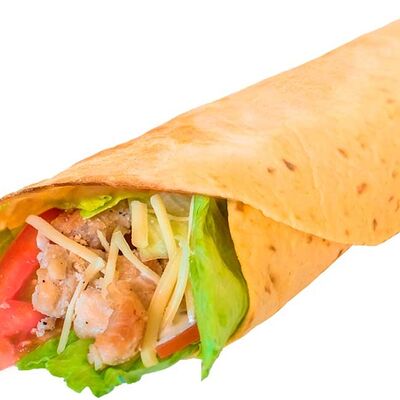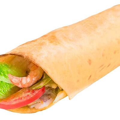 Пшеничная лепешка, микс листьев салата, креветки, помидоры, сыр пармезан, соус чесночный