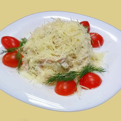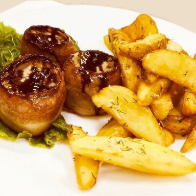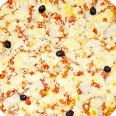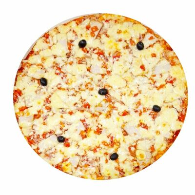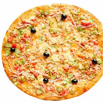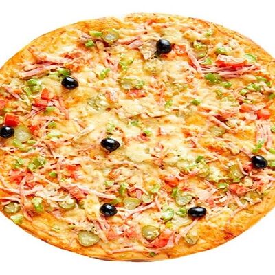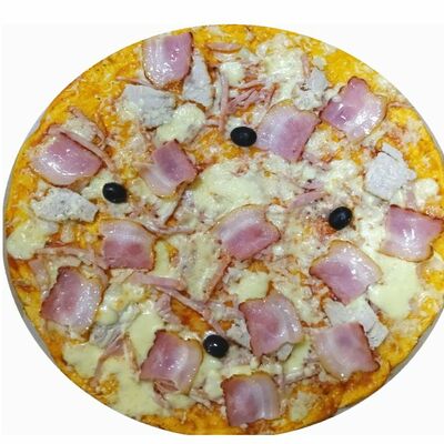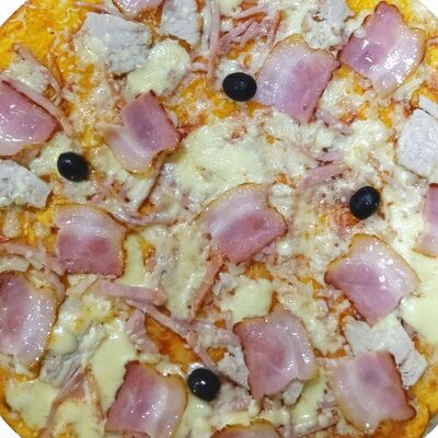 Бекон, карбонад, ветчина, лук, сыр, соус томатный, масло растительное, мука, дрожжи, маслины, специи
