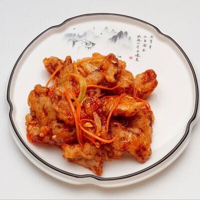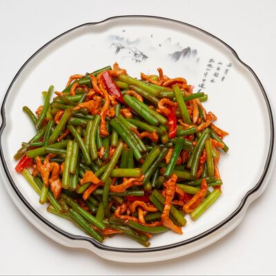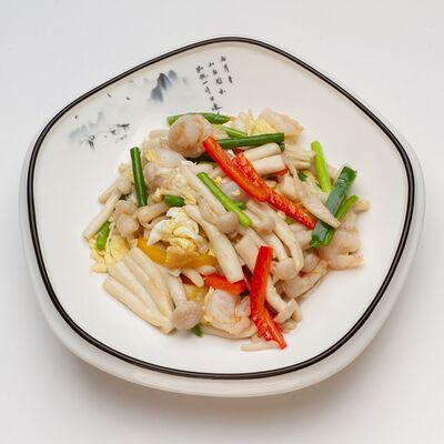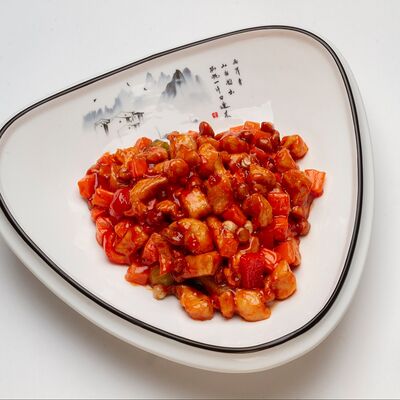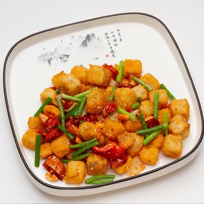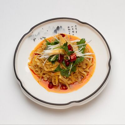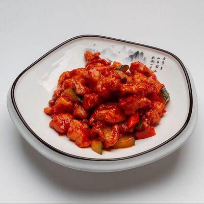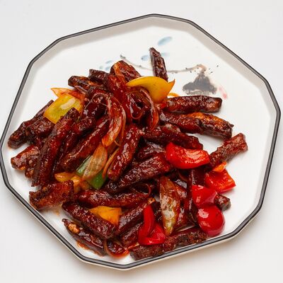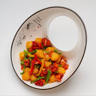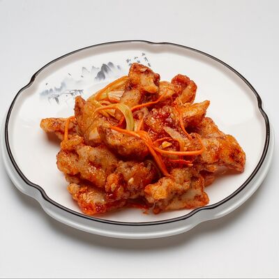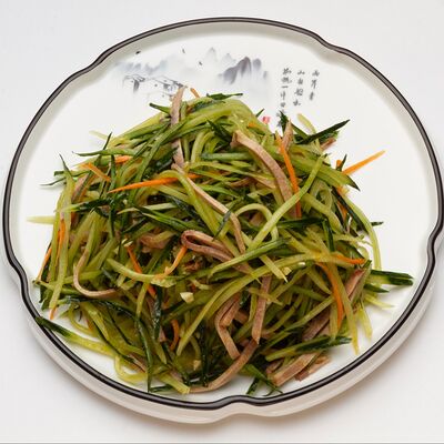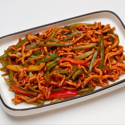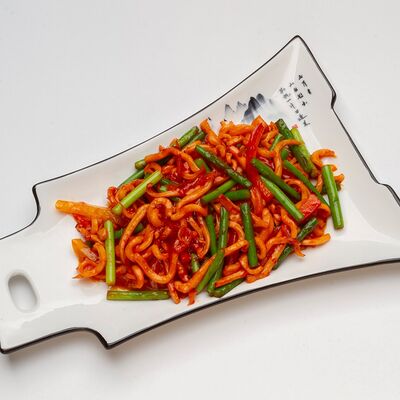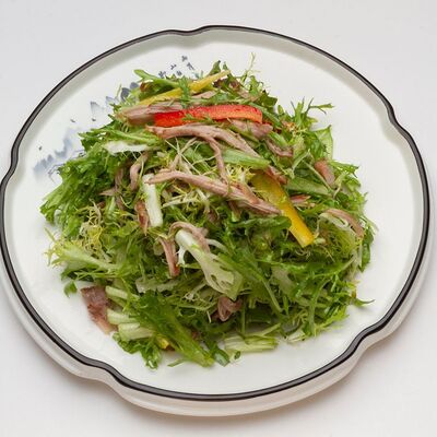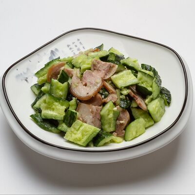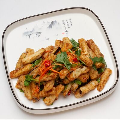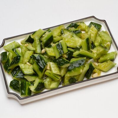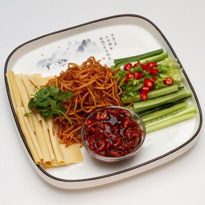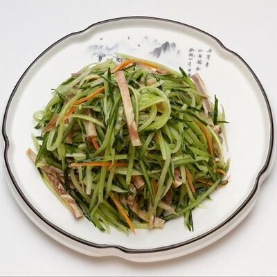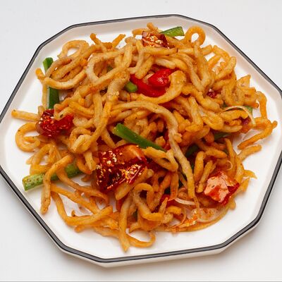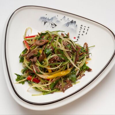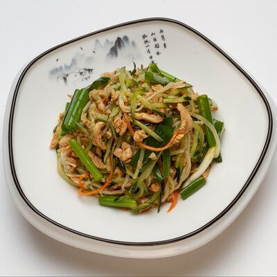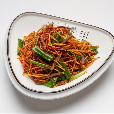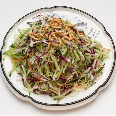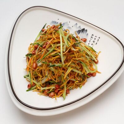 Тертый обжаренный картофель, огурец, лук, арахис, морковь, кинза