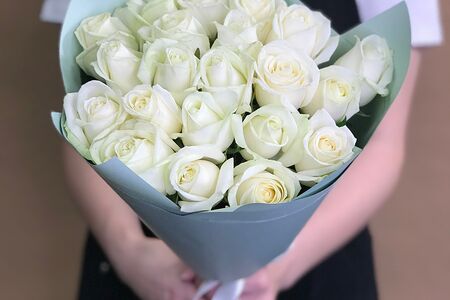Авторский букет цветов из 21 белой розы (40 см), перевязан атласной лентой.