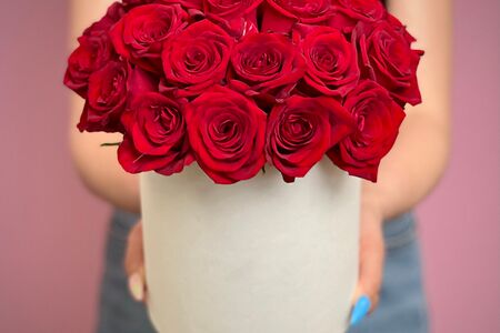 Оригинальная композиция цветов из 25 красных роз в шляпной коробке M.