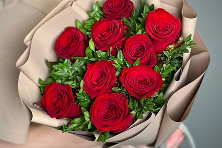 Букет из 9 красных роз с зеленью доставка