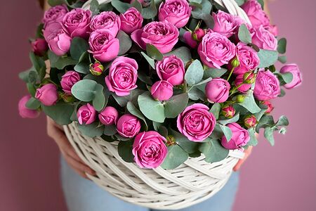 Оригинальная композиция цветов из 17 малиновых кустовых пионовидных роз и эвкалипта в корзине M.