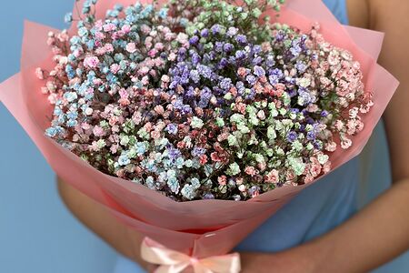Авторский букет цветов из 5 разноцветных гипсофил в оформлении, перевязан атласной лентой, Грёзы.