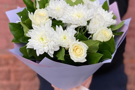 Авторский букет цветов из 5 белых роз, 2 кустовых хризантем и рускуса в оформлении, перевязан атласной лентой, Рафаэлка.