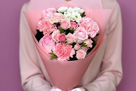Авторский букет цветов из 3 роз, 2 кустовых роз, 3 гвоздик, хризантемы сантини и писташи в оформлении, перевязан атласной лентой, Розовая идиллия.