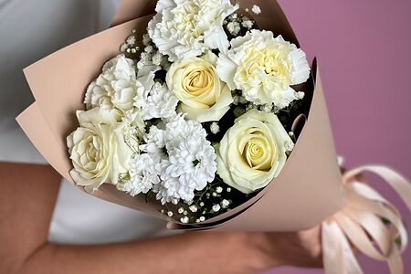 Букет цветов из 3 роз, 3 гвоздик, хризантемы сантини, гипсофилы в оформлении, перевязан атласной лентой, Моя прелесть.