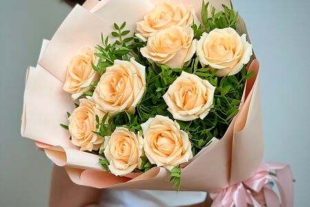 Авторский букет цветов из 9 кремовых роз и писташа в оформлении, перевязан атласной лентой.
