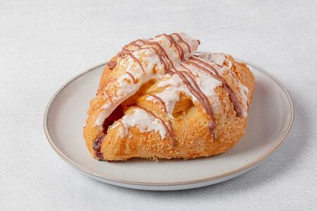 Слоёная дрожжевая булочка с кусочками свежей груши, ванильной помадкой внутри. Снаружи декорирована молочным шоколадом