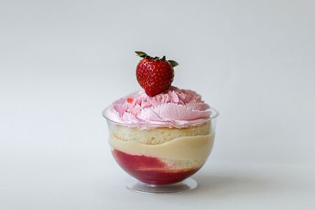 Уваренная клубника, творожный бисквит, заварной творожно-персиковый крем, сахарный сироп, крем на растительных клубничных сливках, свежая клубника