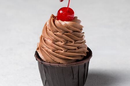 Шоколадный капкейк с вишней и шоколадным кремом, украшен коктейльной черешней (Внешний вид изделия может отличаться от фото)
