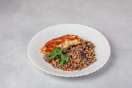 Сочное куриное бедро, запеченное под сыром моцарелла с гречкой и шампиньонами