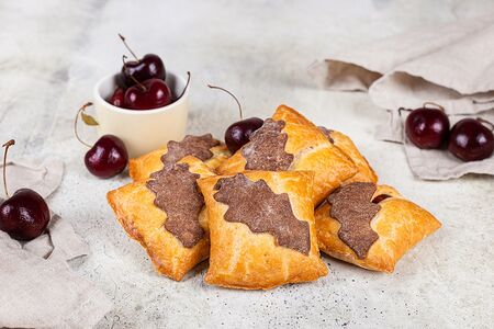 Изящные конвертики изготавливаются из тонко раскатанного нежного легкого песочного теста на твороге с начинкой из натуральной ароматной вишни. Пирожное вручнуе украшено узором. Карманчики получаются очень легкими, нежными, вкусными и полезными!