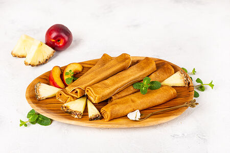 Тонкие блинчики для истинных гурманов, приготовлены по классическому рецепту на бездрожжевом тесте, без всяких добавок. В составе свежие деревенские яйца, отборное сливочное масло, молоко и пшеничная мука высшего сорта. Начинка только из свежих и натуральных ингредиентов: джем из ананасов, лимонов, персиков, кураги и нежный творожный крем-сыр. Блинчики У Палыча - это ручная работа от мастеров блинного дела!