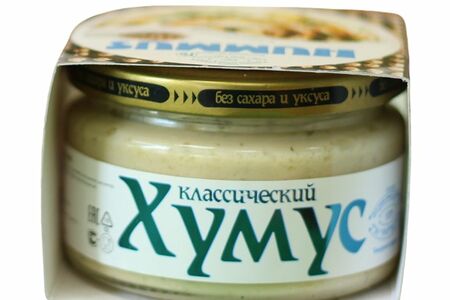 Хумус - это традиционная восточная закуска из нута, тахины, оливкового масла, лимонного сока, специй и чеснока. Хумус можно употреблять как соус, как основу для бутерброда и как готовый гарнир. Состав: нут, вода питьевая, тахини, масло подсолнечное, масло оливковое, соль, крахмал кукурузный, семя кунжута, регулятор кислотности (лимонная кислота), чеснок, консерванты (сорбат калия, бензоат натрия), укроп, петрушка, перец красны молотый. Срок годности: 10 месяцев. Пищевая ценность (на 100 г): углеводы - 14 г., белки - 6,0 г., жиры - 12,0 г. Энергетическая ценность (на 100 г) : 188 ккал. Условия хранения: Хранить при температуре не более 25°С и относительной влажности воздуха не более 75%.