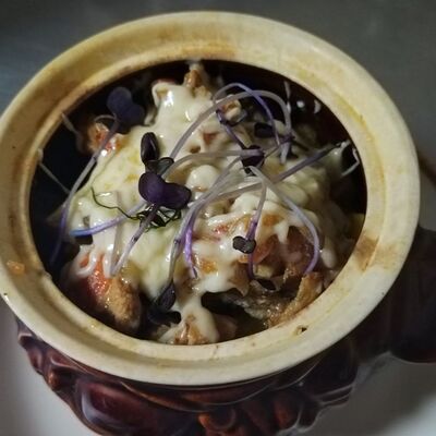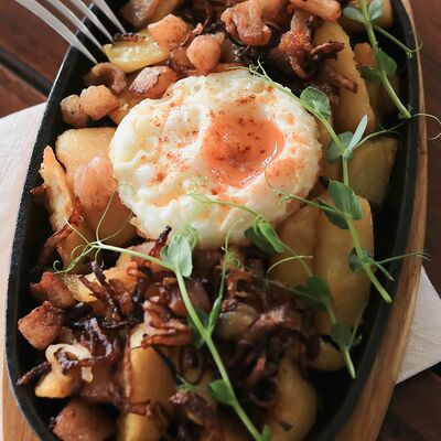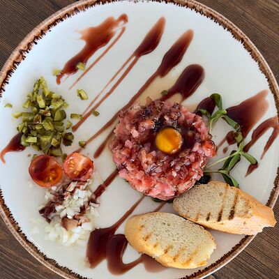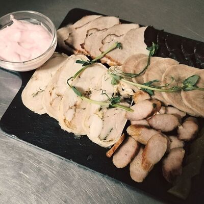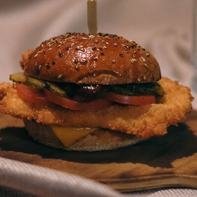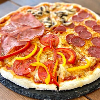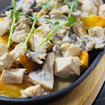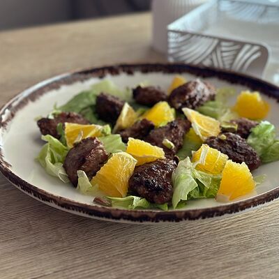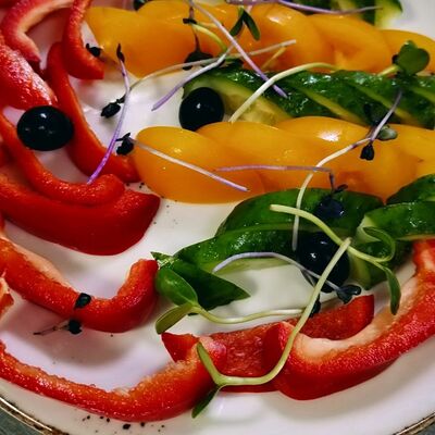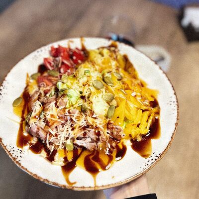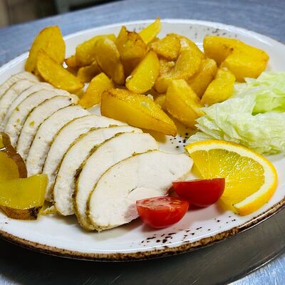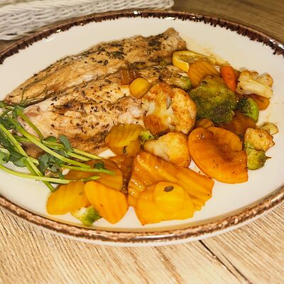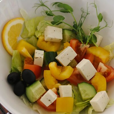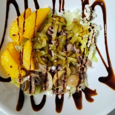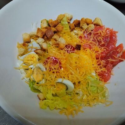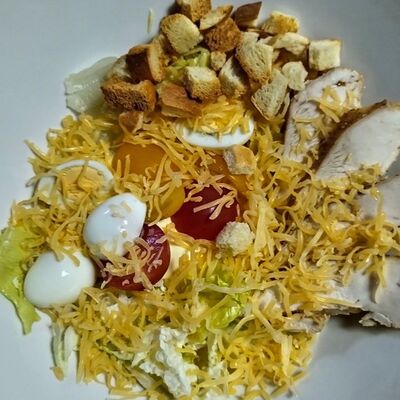 Салатная смесь, томаты черри, яйцо перепелиное, сыр пармезан, соус цезарь, гренки, филе птицы