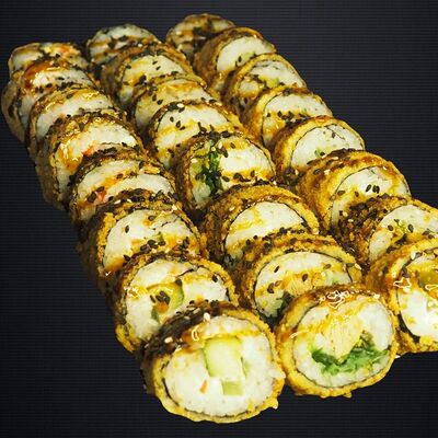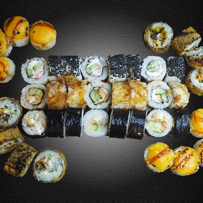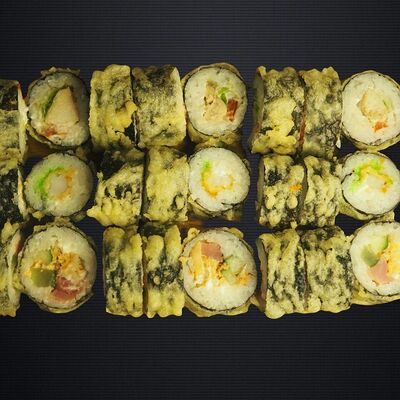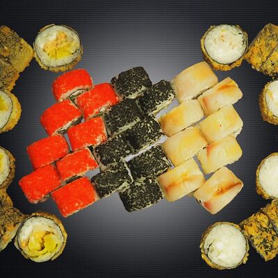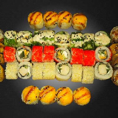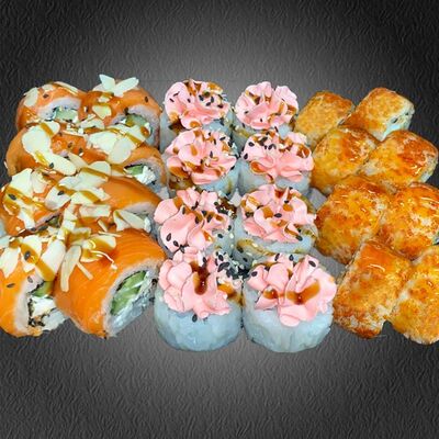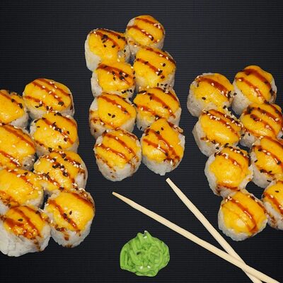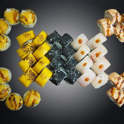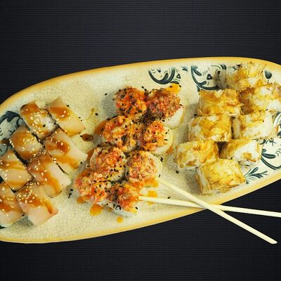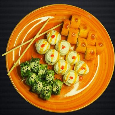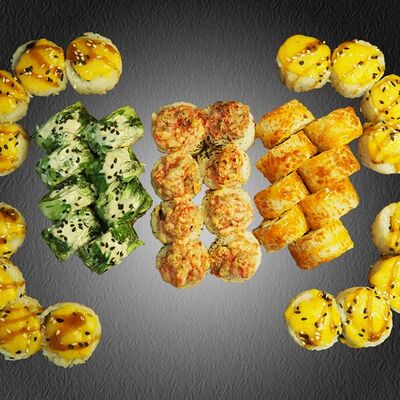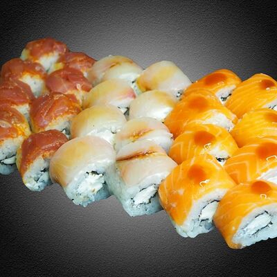 Ролл Грин (лосось, чука, крем-чиз, ореховый соус), ролл Фила, ролл Киво (креветка, салат айсберг, шапка крем-чиз, красная икра масаго)