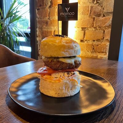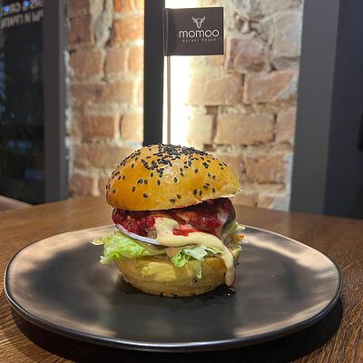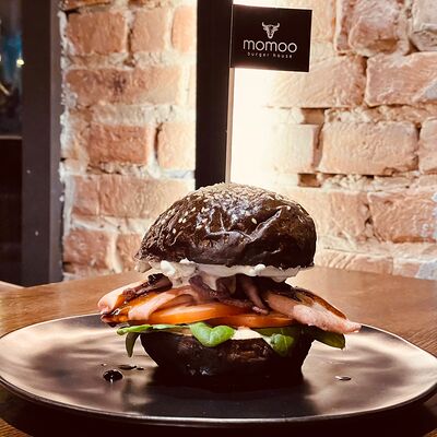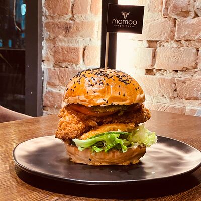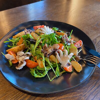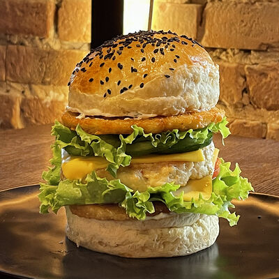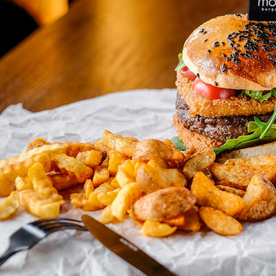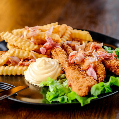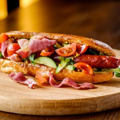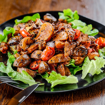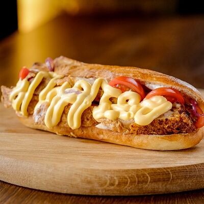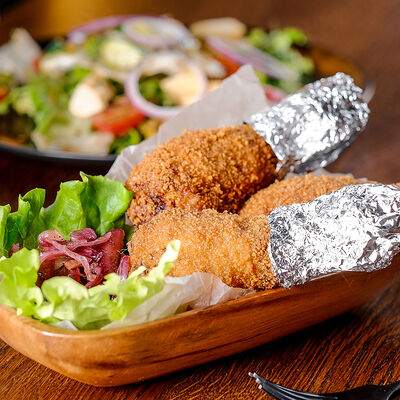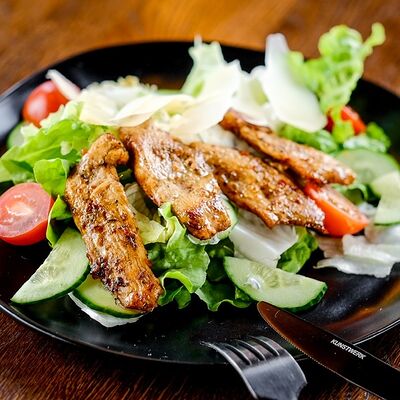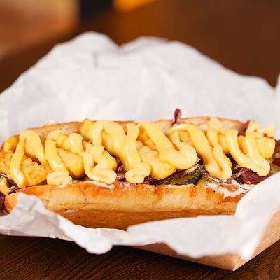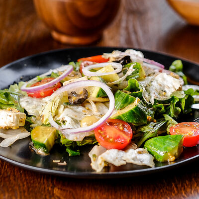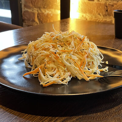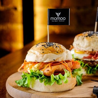 Филе семги, соус Крем-чиз, лист салата, фирменный сырный соус, томат, пряная морковь