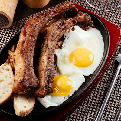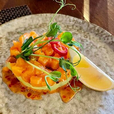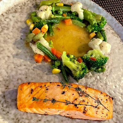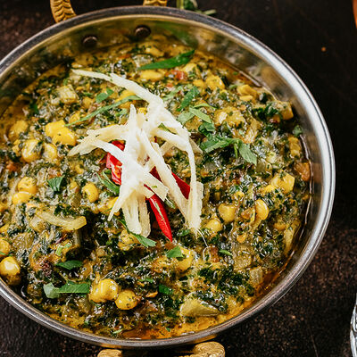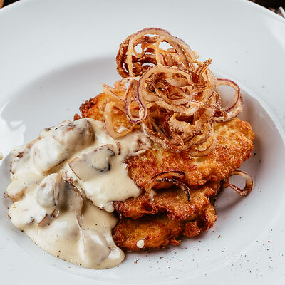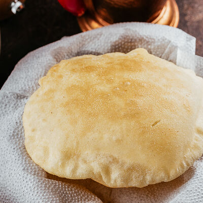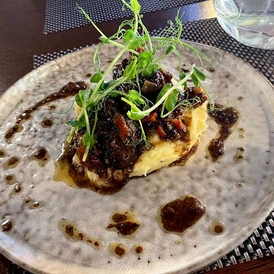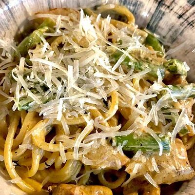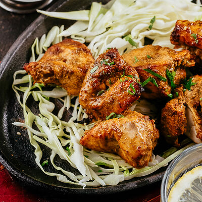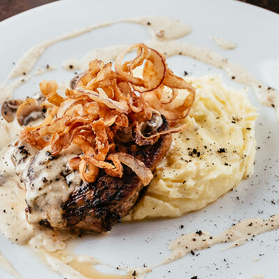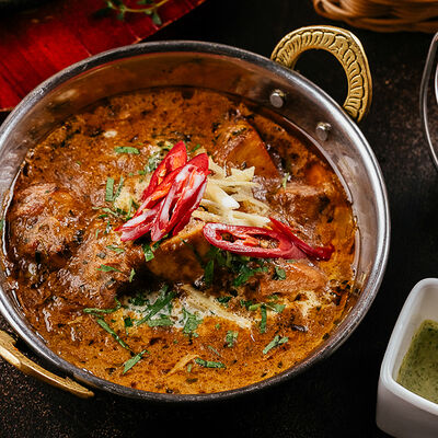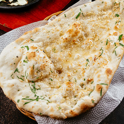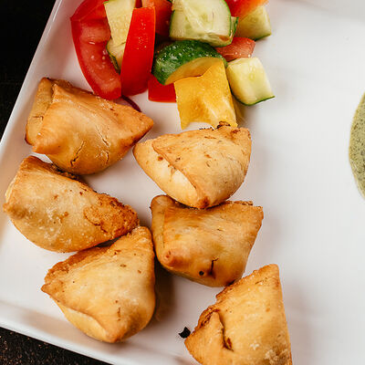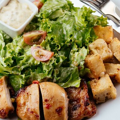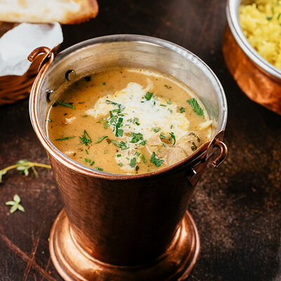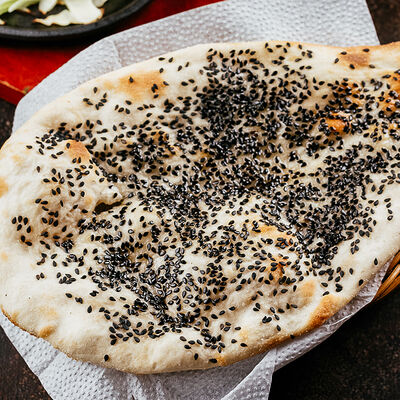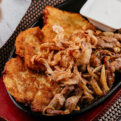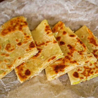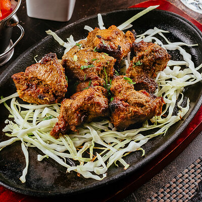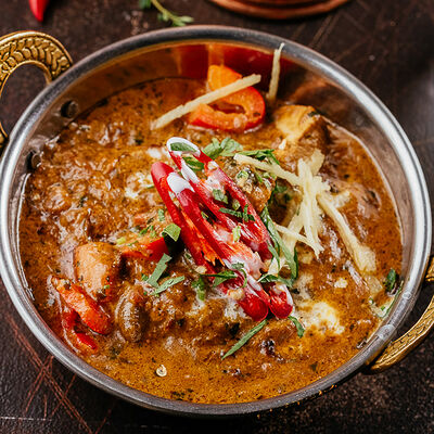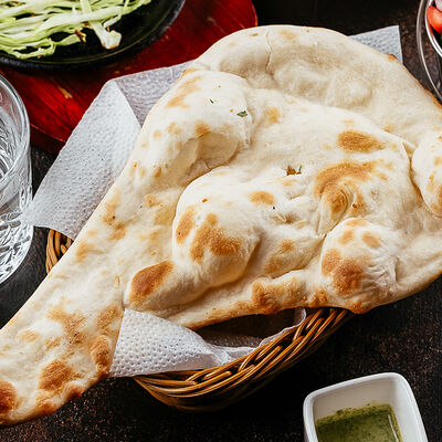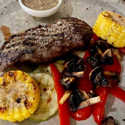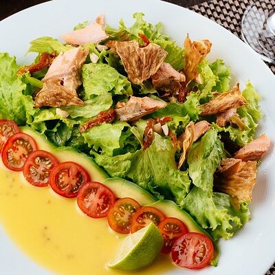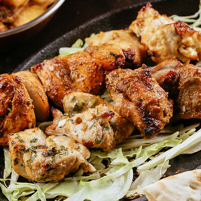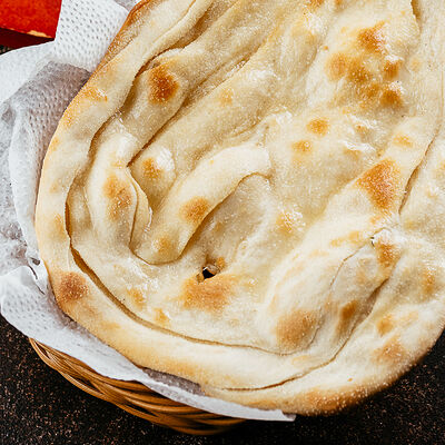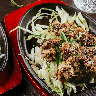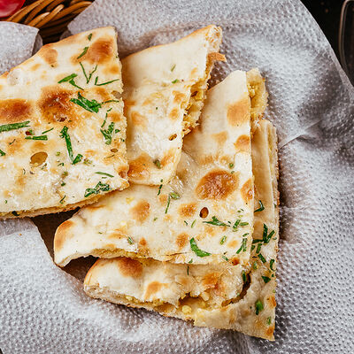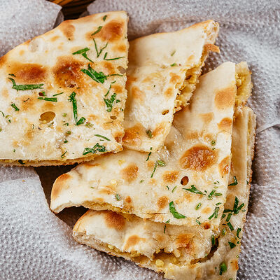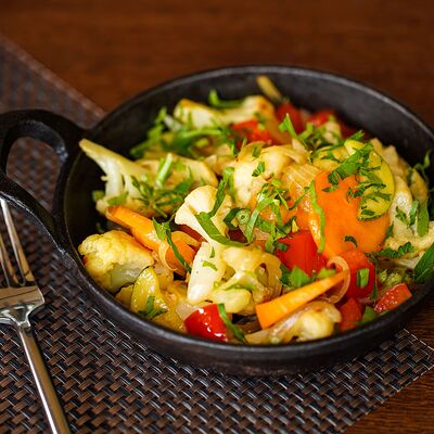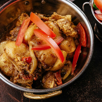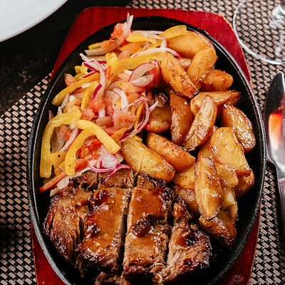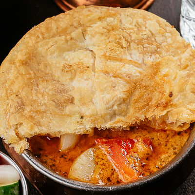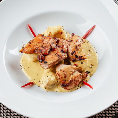 Кусочки куриного филе в соусе из ананаса, болгарского перца и лука, запечённые под лепёшкой