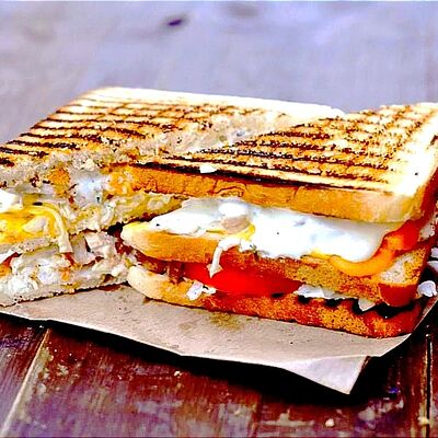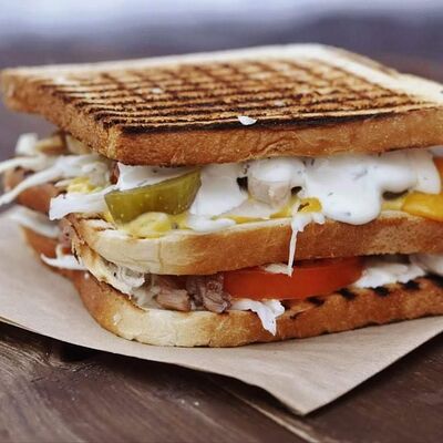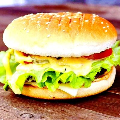 Куриное филе, помидор, салат, сухарики, сыр, соус цезарь