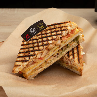 Куриный бульон, куриное филе, лапша, яйцо отварное, зелень, сельдерей (400 г). Сэндвич с курицей (200 г)