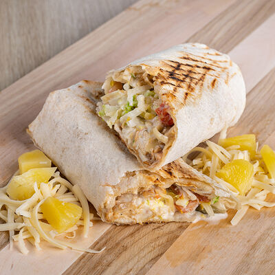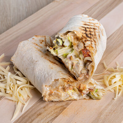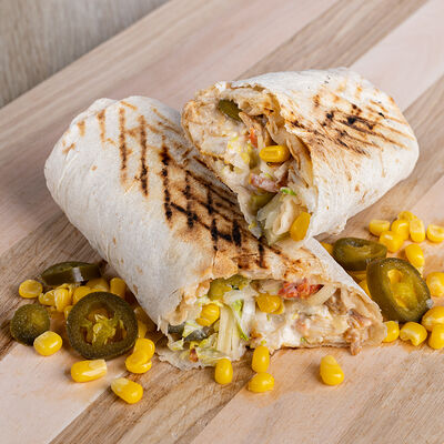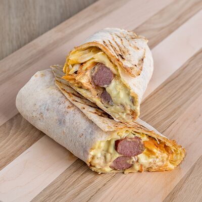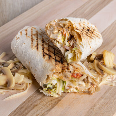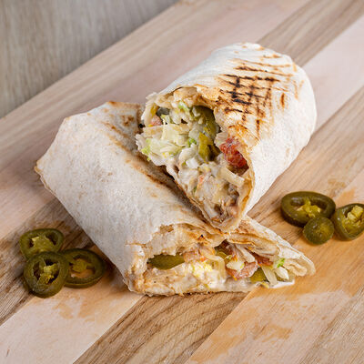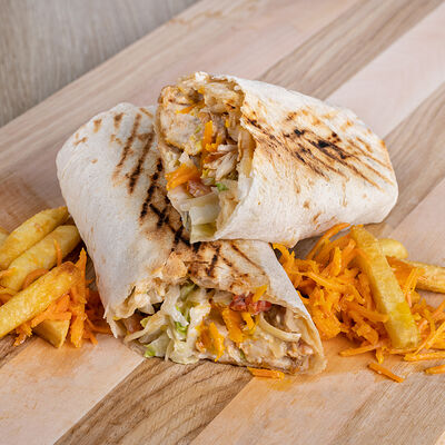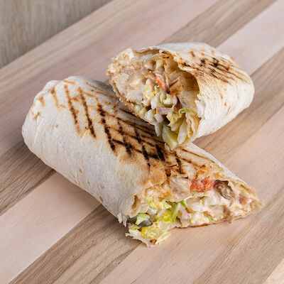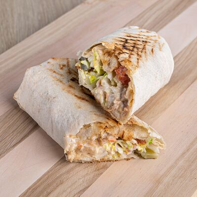 Лаваш, курица, фирменный соус, салат из капусты, маринованный огурец, помидор