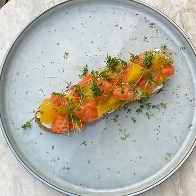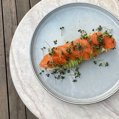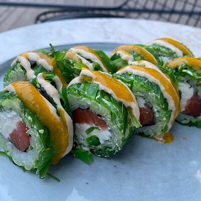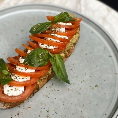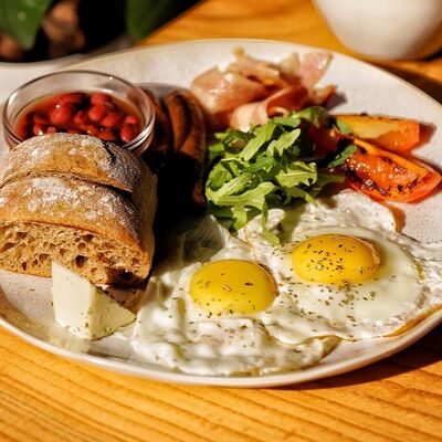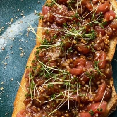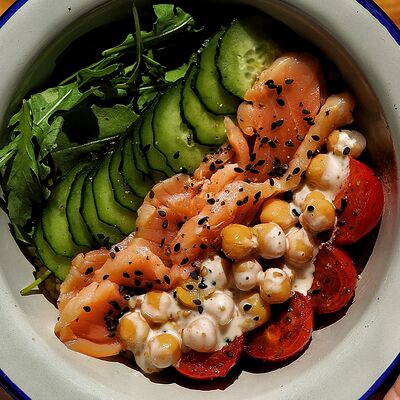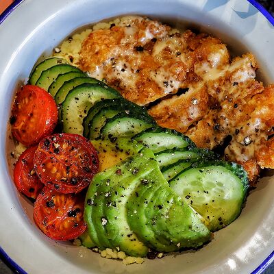 Рис, томаты, яйцо, куриное филе, пармезан, крутоны, соус цезарь, кунжут, микрозелень