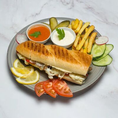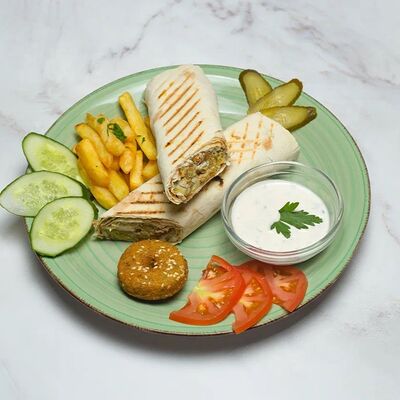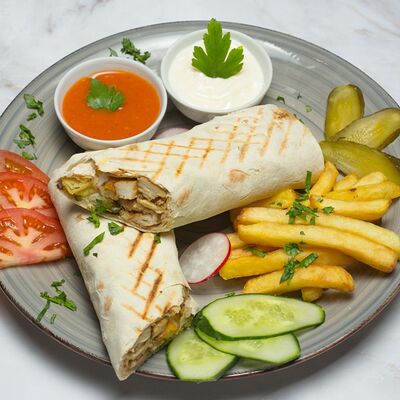Лаваш, куриное филе, соленые огурцы, томаты соус фирменный