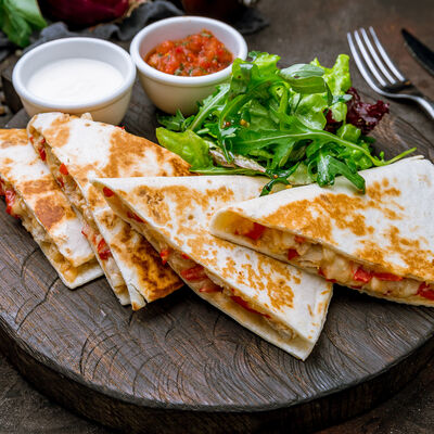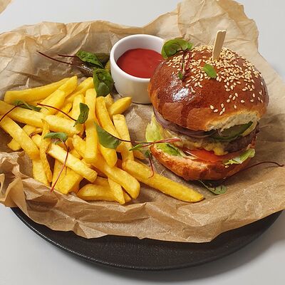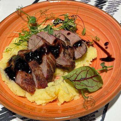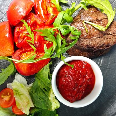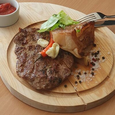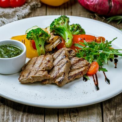 Медальоны из говяжьей вырезки подаются с соусом на выбор и шампиньонами гриль