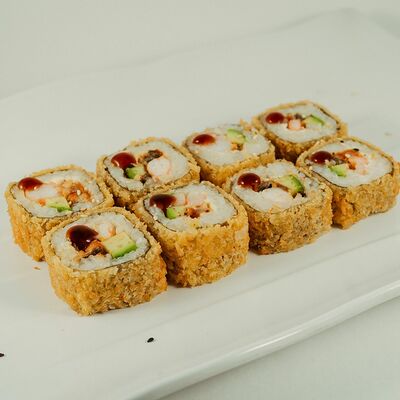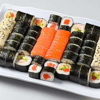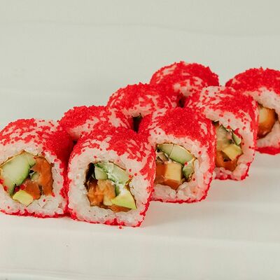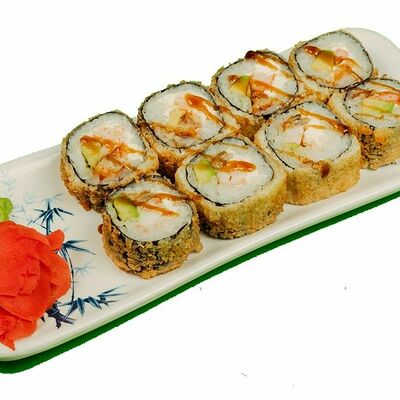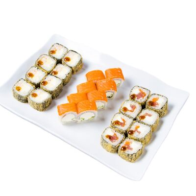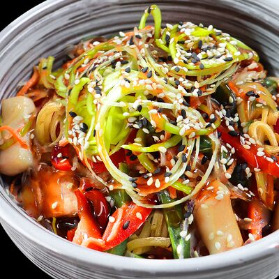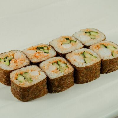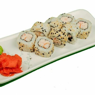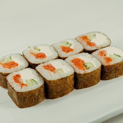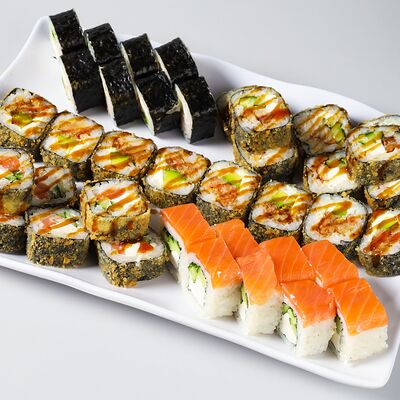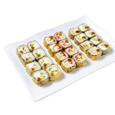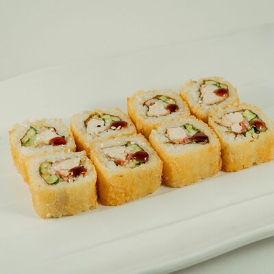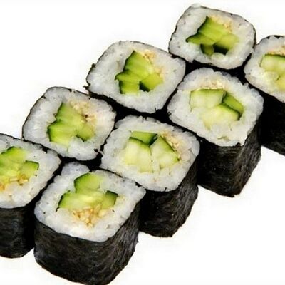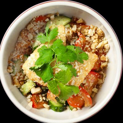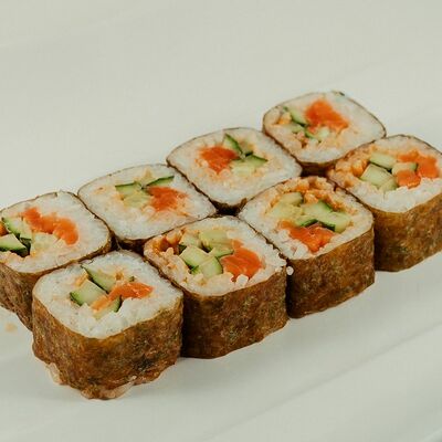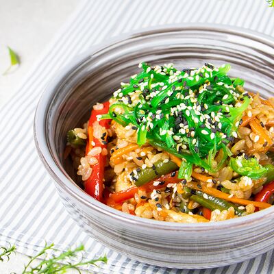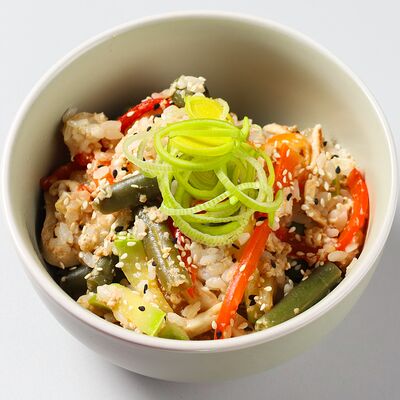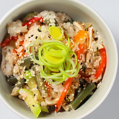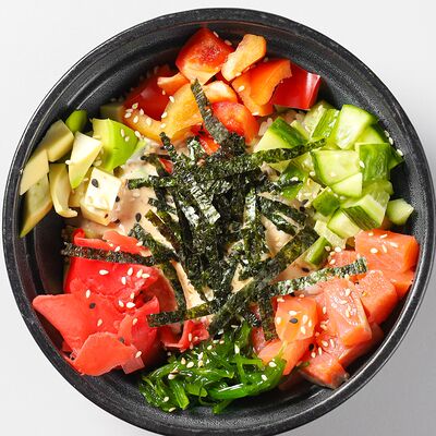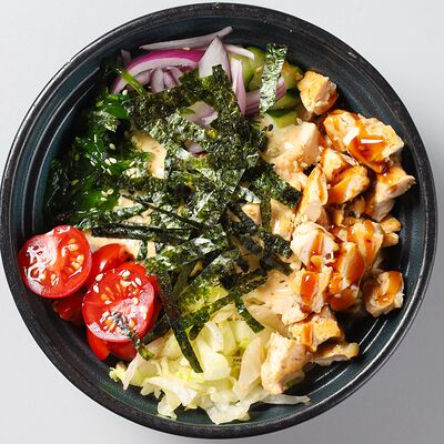 Рис, соевый соус, куриное филе, айсберг, помидоры черри, огурцы, нори, кунжут, водоросли чука, ореховый соус, соус Терияки