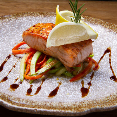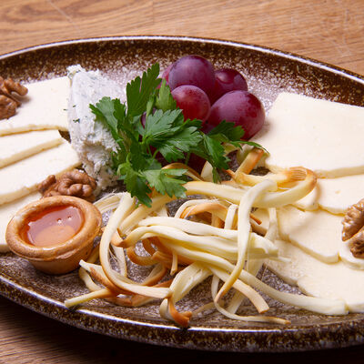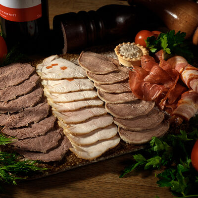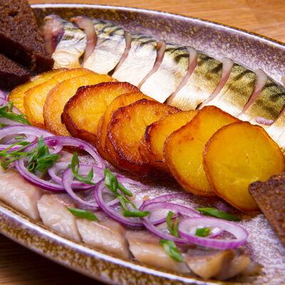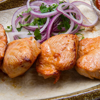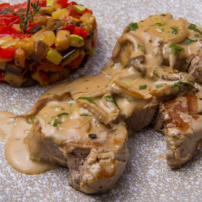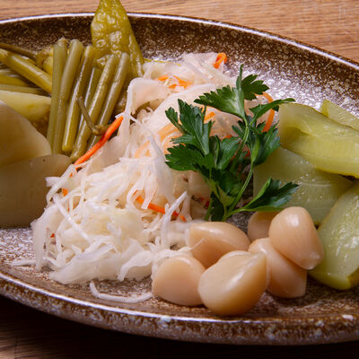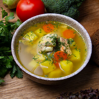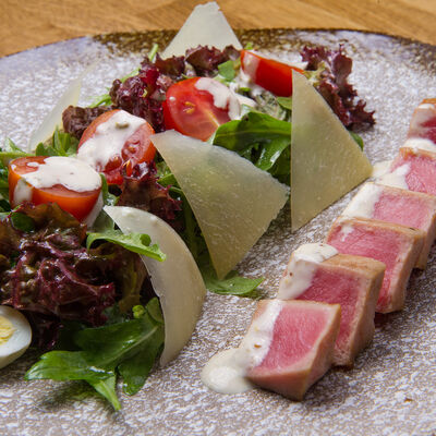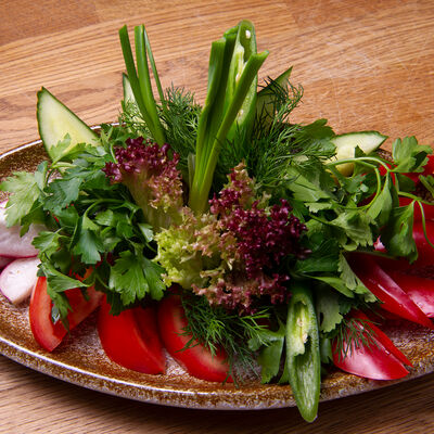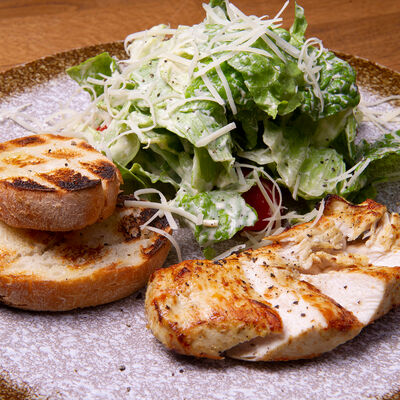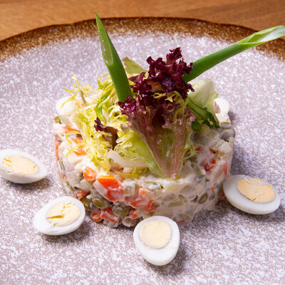 Филе индейки, перепелиное яйцо, картофель, морковь, огурцы, зеленый горошек