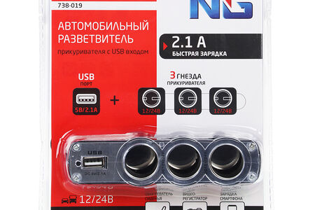 Ng разветвитель прикуривателя, 3 выхода +1 usb, 60 w, 2.1а, 12/24в, пластик доставка