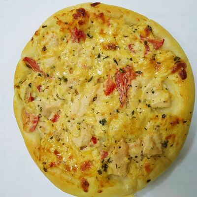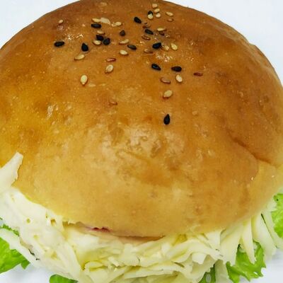 Пшеничная булочка с кунжутом, куриное филе, помидор, сыр Моцарелла, маринованный репчатый лук, лист свежего салата, соус