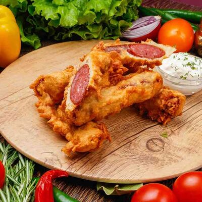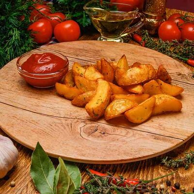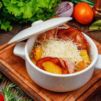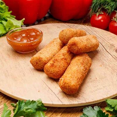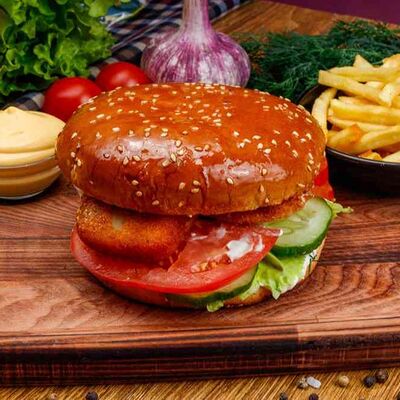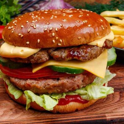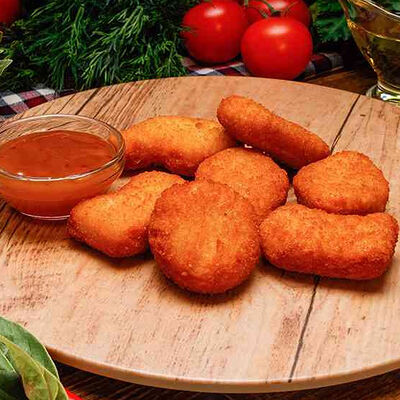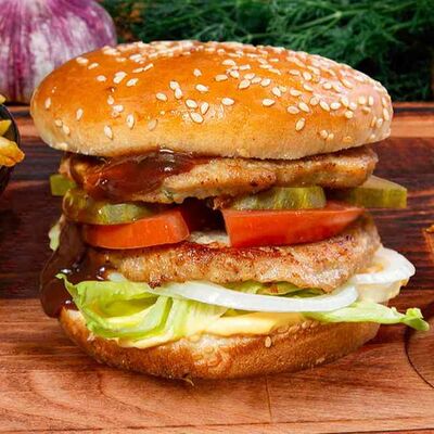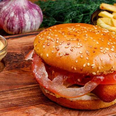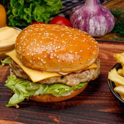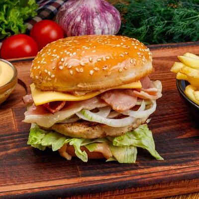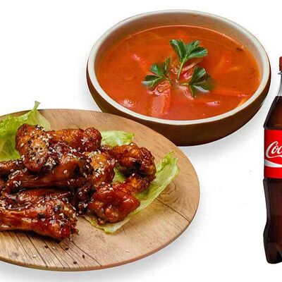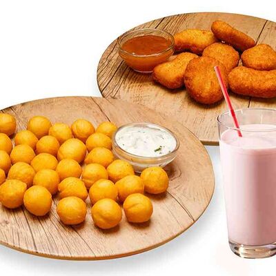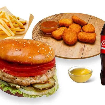 Бургер По-деревенски (185 г), подается с картофелем фри (50 г) и сырным соусом (30 г), Наггетсы куриные (120 г), кисло-сладкий соус (30 г), Coca-Cola (500 мл)