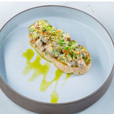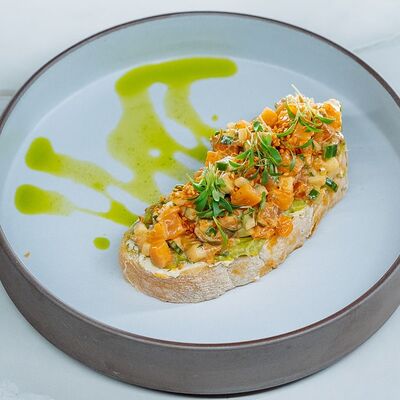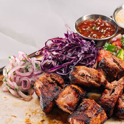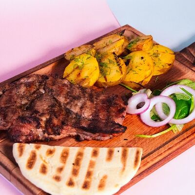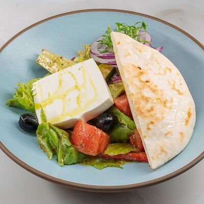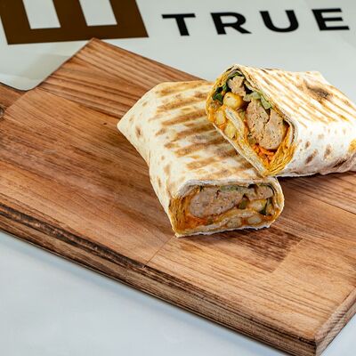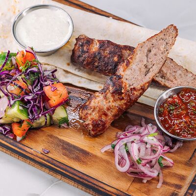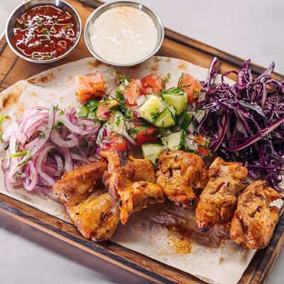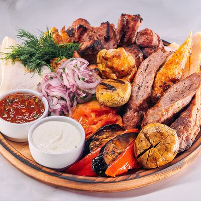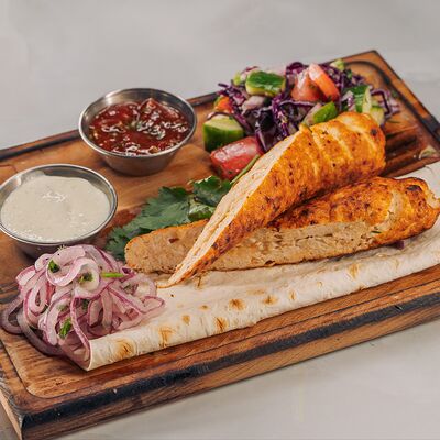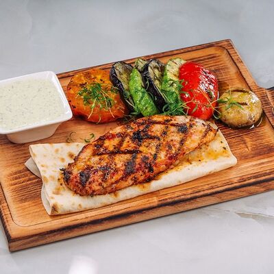 Филе куриное, томаты, перец болгарский, кабачки, баклажаны, тартар, сиртаки, лаваш, зелень