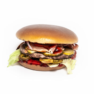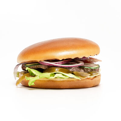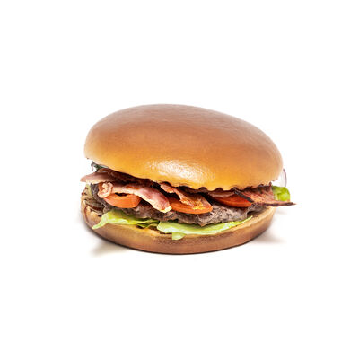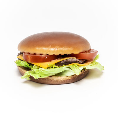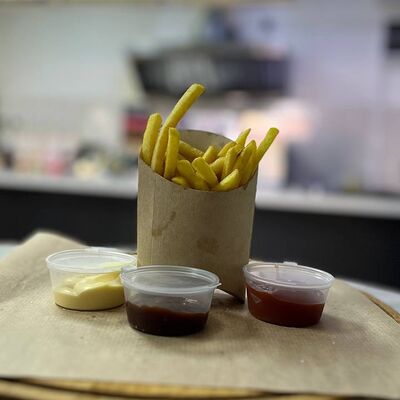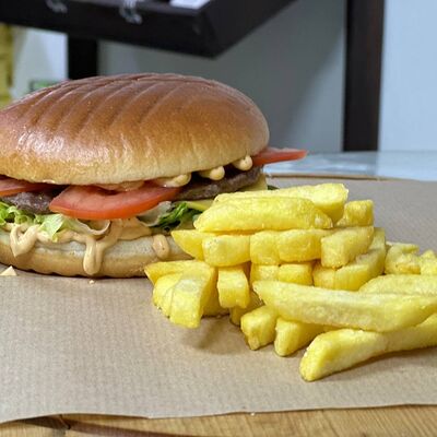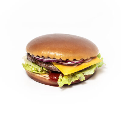 Бургер (булочка бриошь, котлета из говядины, салат айсберг, двойной сыр чеддер, сладкий красный лук, соус томатный, соус сырный), картофель фри, соус на выбор
