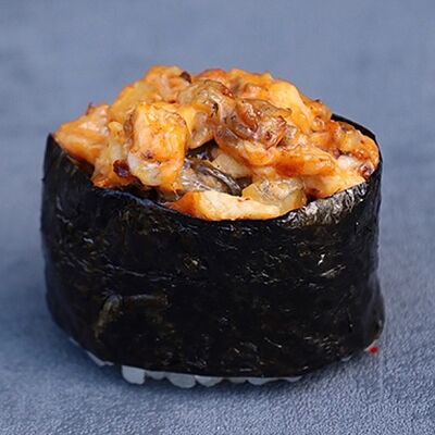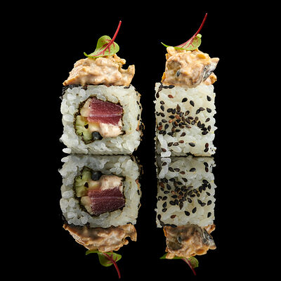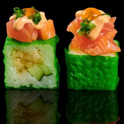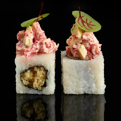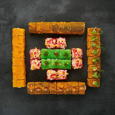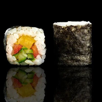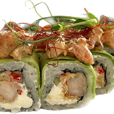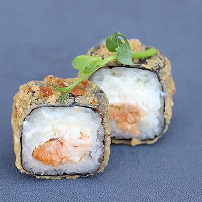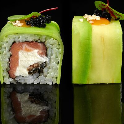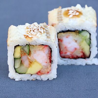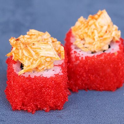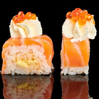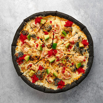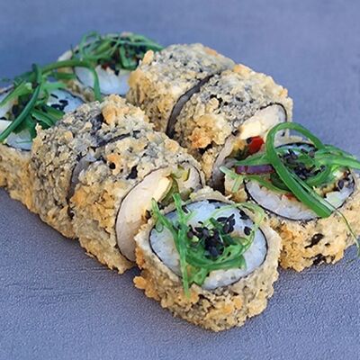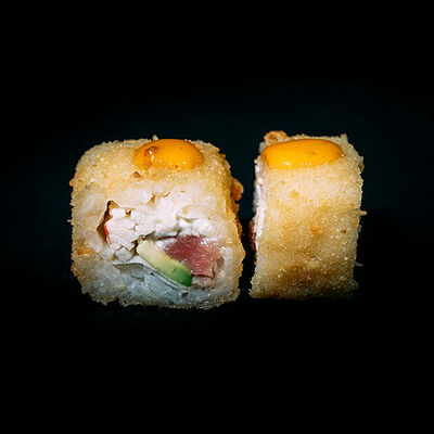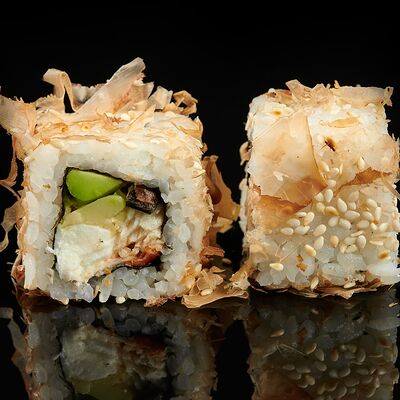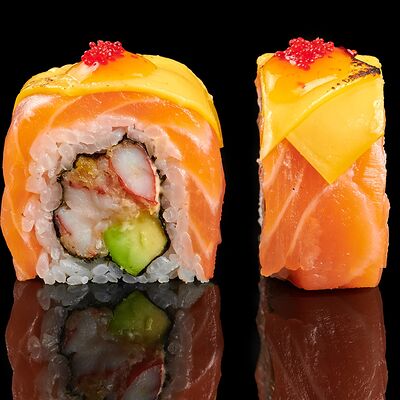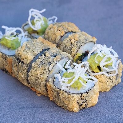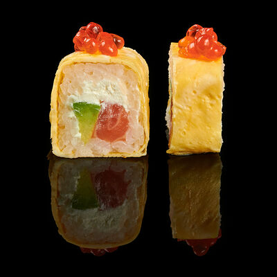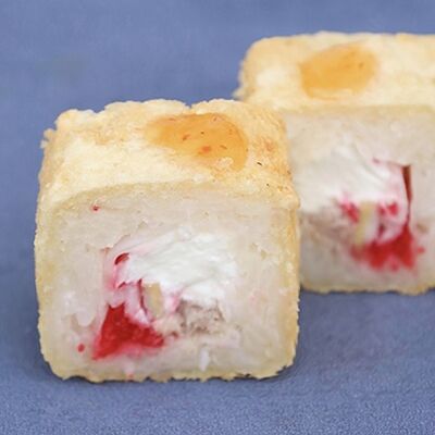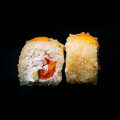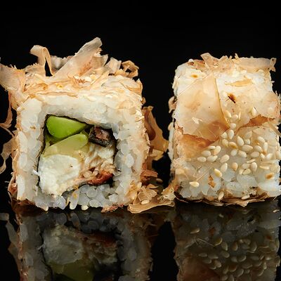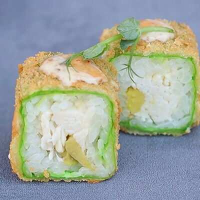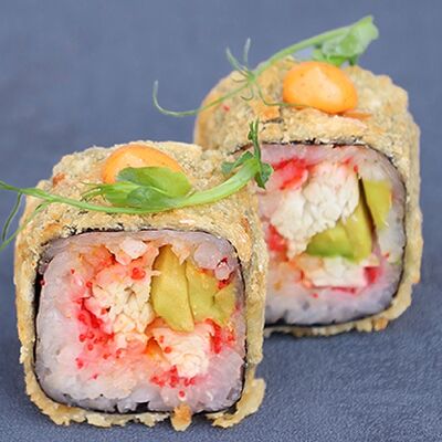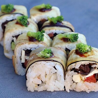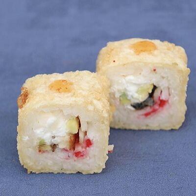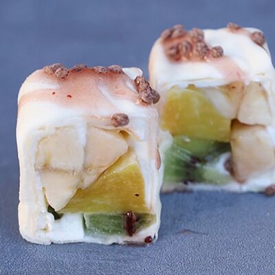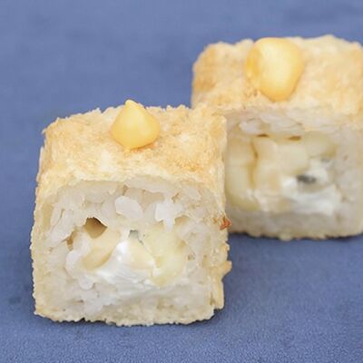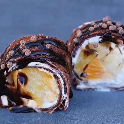 Тесто для роллов, банан, персик, киви, сахарная пудра, сыр креметте, воздушная кукуруза, карамельный топпинг