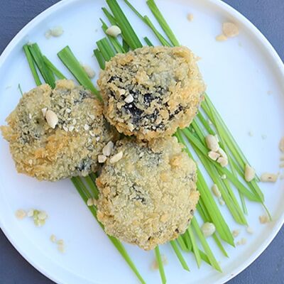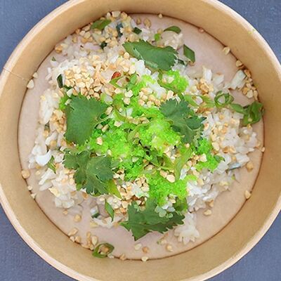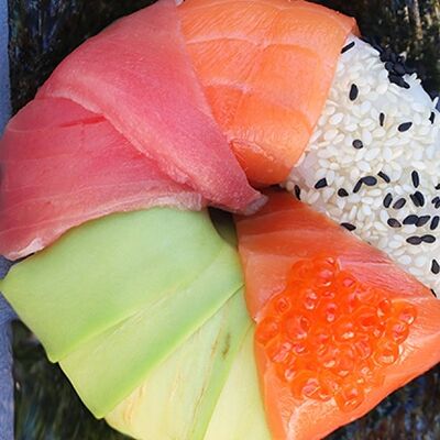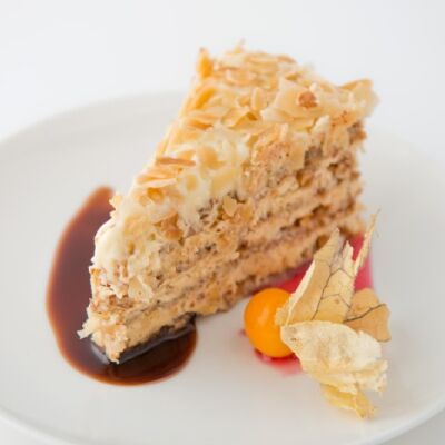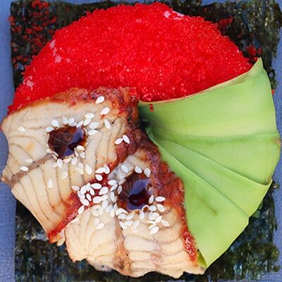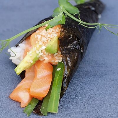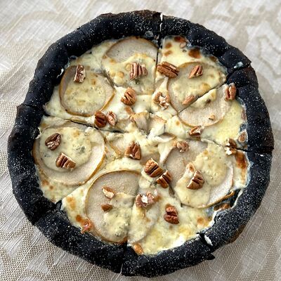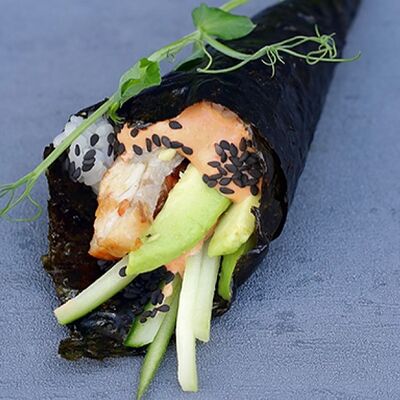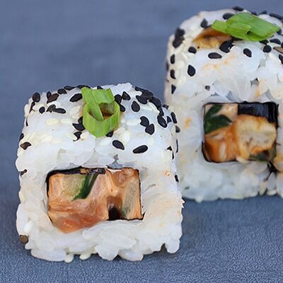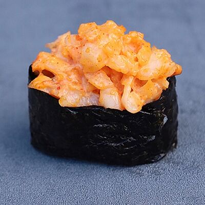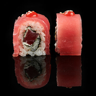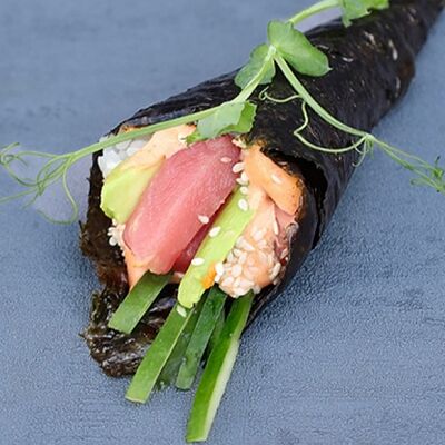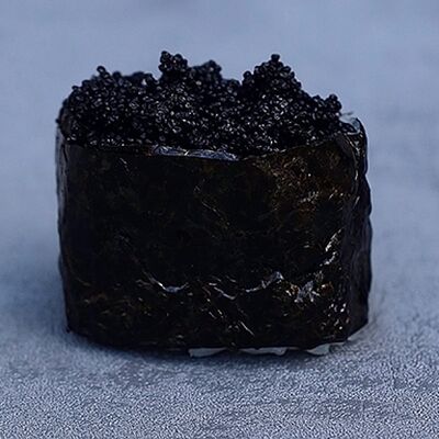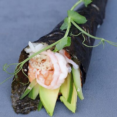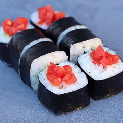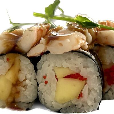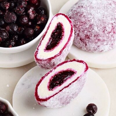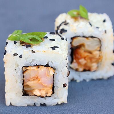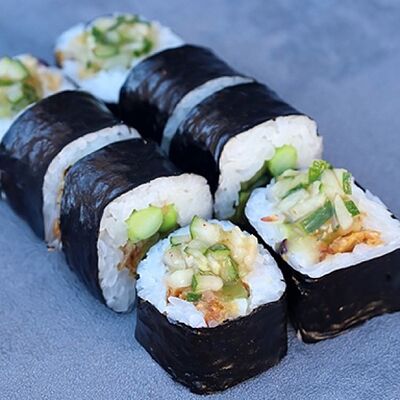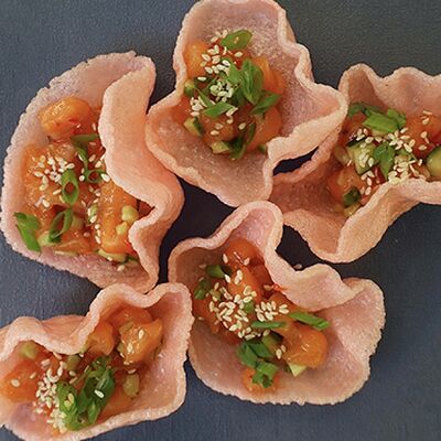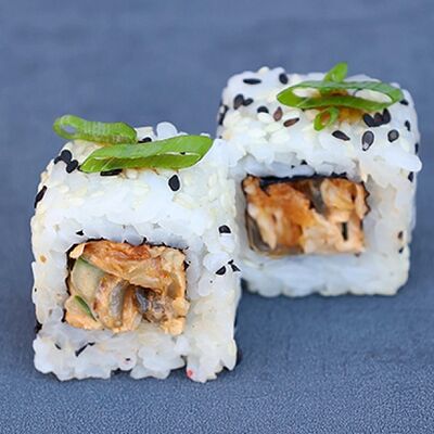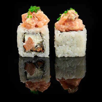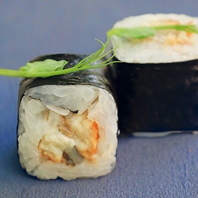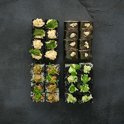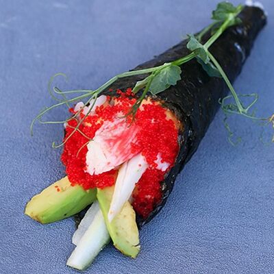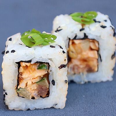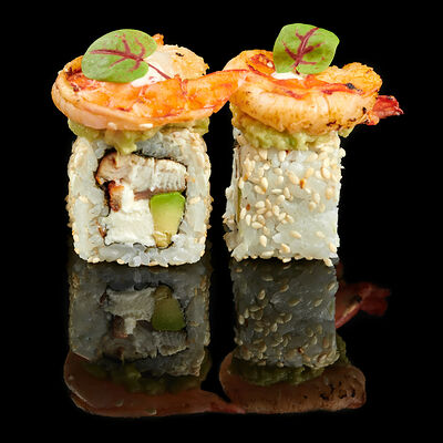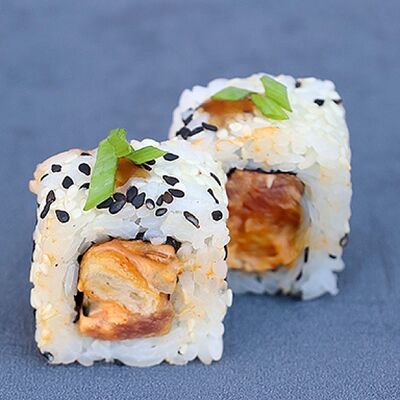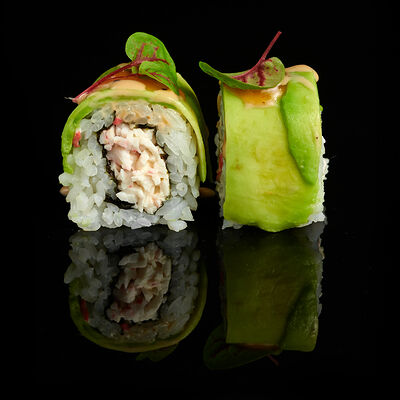 Тесто для роллов, банан, персик, киви, сахарная пудра, сыр креметте, воздушная кукуруза, карамельный топпинг