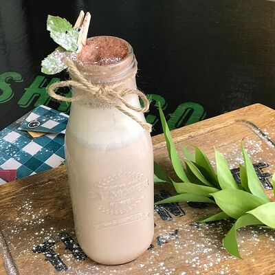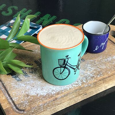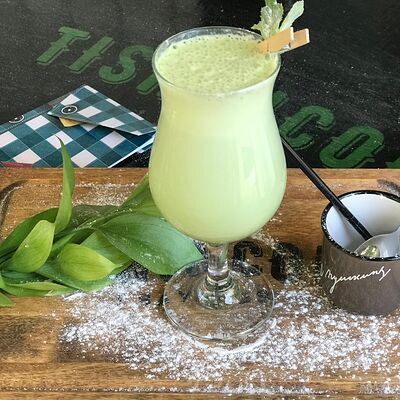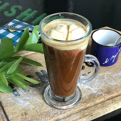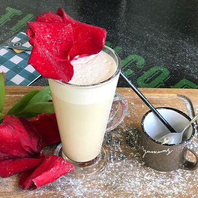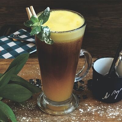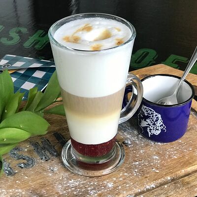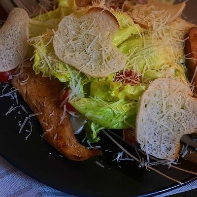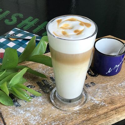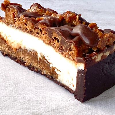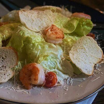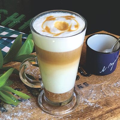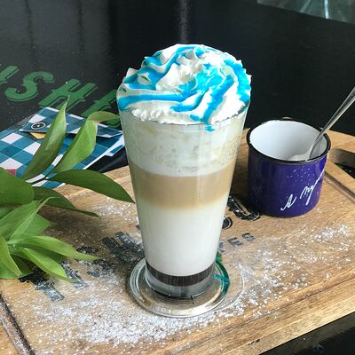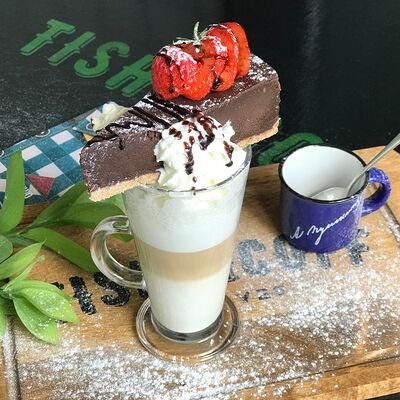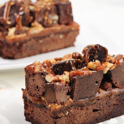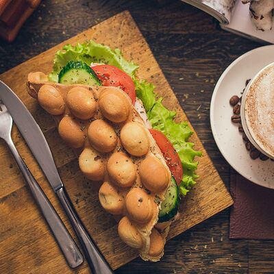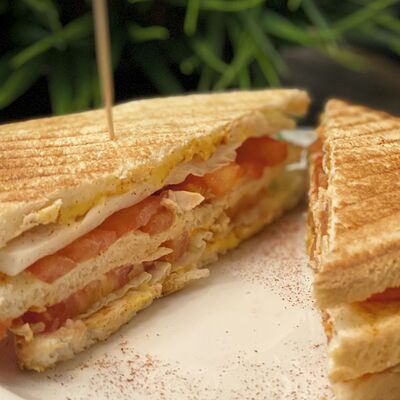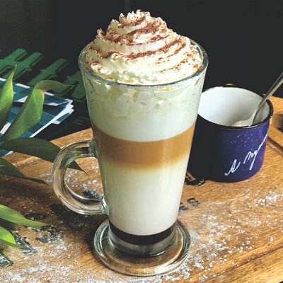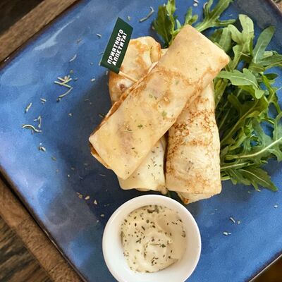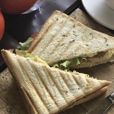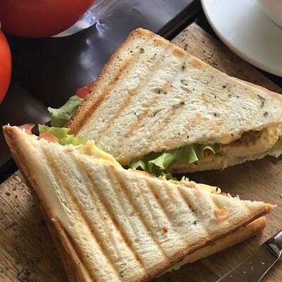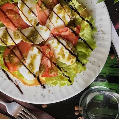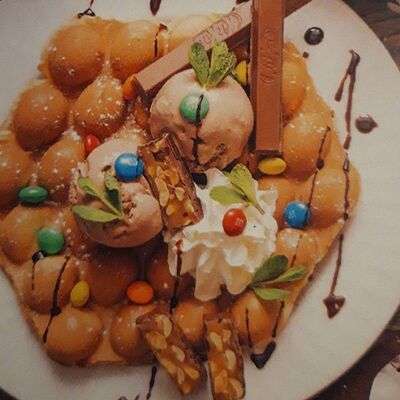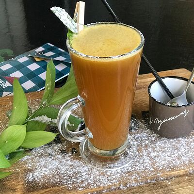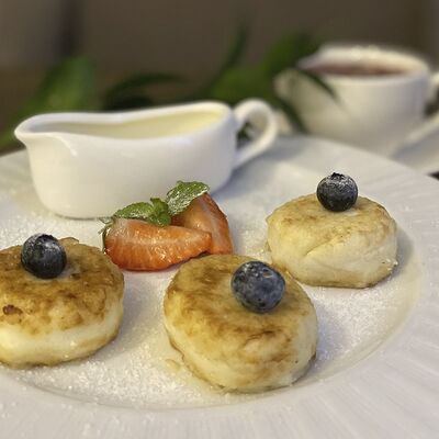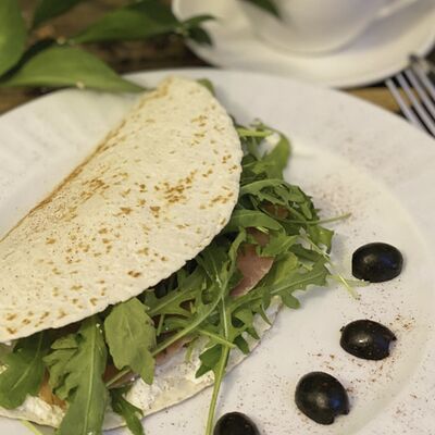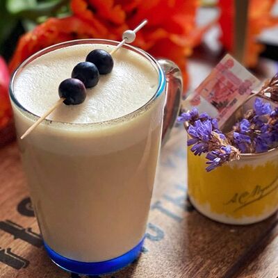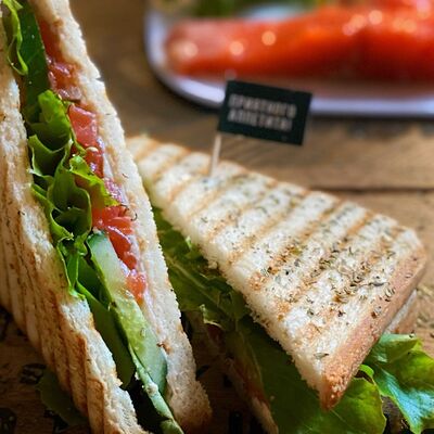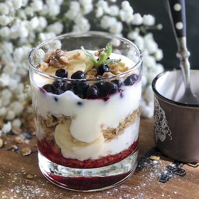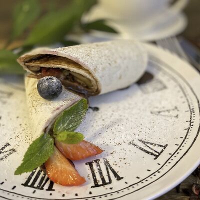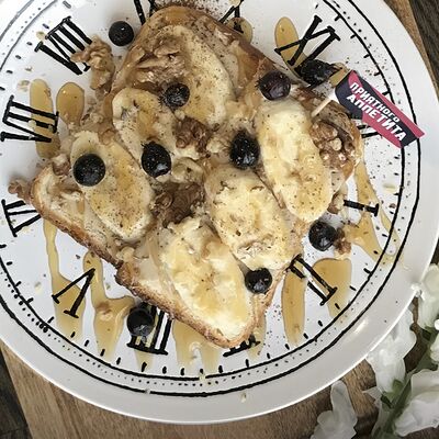 Хрустящий тост с арахисовой пастой, украшенный грецкими орехами, черникой и бананами. Подается с карамельным соусом