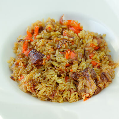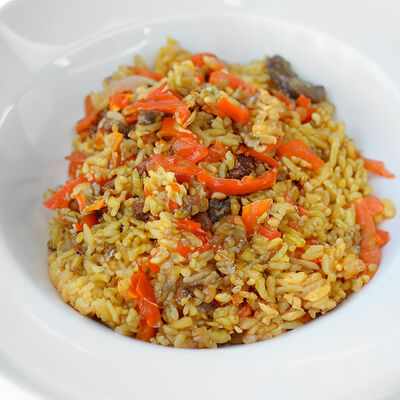 Говядина, сало cвинoе, рис длиннозерный, лук репчатый, морковь, масло подсолнечное, приправа, чеснок, соль, вода